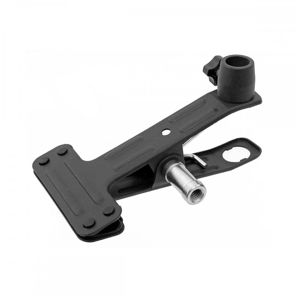 Abrazadera universal con un adaptador de espiga en el lado. La abrazadera de estudio se puede conectar a una mesa de disparo, estante o a una mesa. En la parte superior de la pinza hay un agujero de 5/8″ con rosca de ajuste.