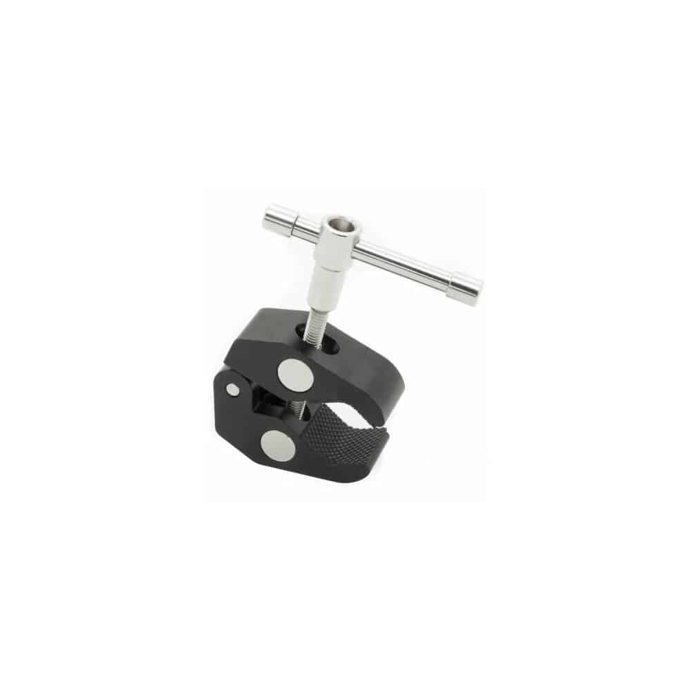 Una abrazadera resistente con un rango de apertura máximo de 5 cm. Las terminaciones recauchutadas de la abrazadera aseguran una fijación estable de los tubos o los trípodes. A un lado, hay unas roscas hembras de 1/4″ y 3/8″ para que se pueda conectar cada trípode de cámara, soporte de luces o cualquier otro accesorio con rosca de trípode.