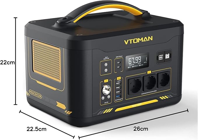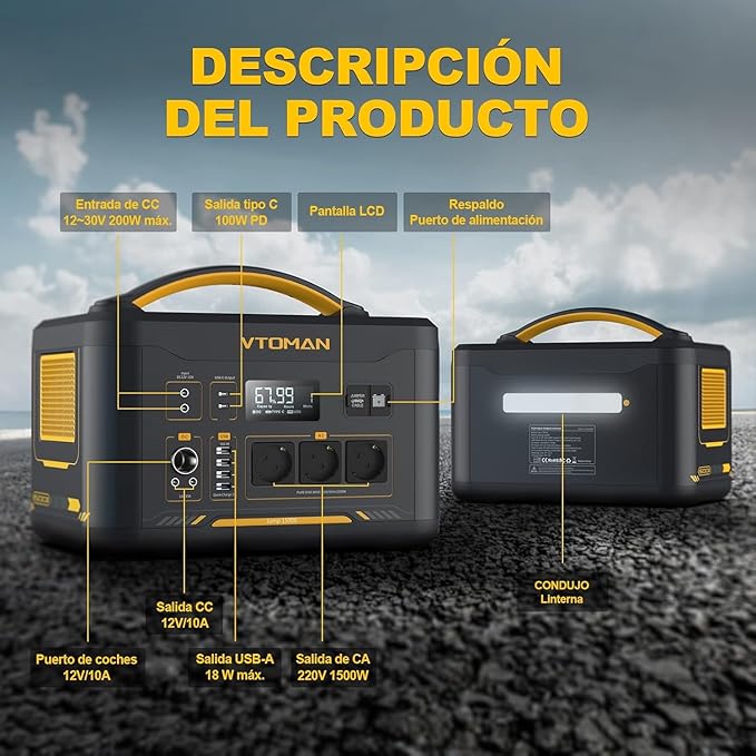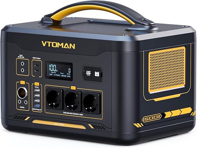 【Estación Eléctrica Portátil SuperSafe LIFEBMS】La VTOMAN Jump 1500X estación eléctrica portátil tiene un sistema de protección SuperSafe LIFEBMS desarrollado por VTOMAN, que proporciona hasta 10 funciones de protección de la batería, tales como sobrecarga, sobredescarga, sobretensión, sobrecorriente, cortocircuito, alta temperatura. Además, gracias a la batería LiFePO4 incorporada, la estación eléctrica portátil VTOMAN Jump 1500X es más resistente al calor y mucho más segura en comparación con la estación eléctrica de batería NCM.【Capacidad Ampliable a 2376Wh】VTOMAN Jump 1500X estación eléctrica portátil tiene una capacidad de 828Wh, La batería adicional Jump 1500 (se vende por separado) es adecuada para Jump 1500X estación eléctrica portátil, por lo que la capacidad de Jump 1500X estación eléctrica portátil se puede ampliar a 2376Wh. Puede alimentar sus dispositivos durante más tiempo. Además, la batería LiFePO4 de alta calidad incorporada conserva el 80% de su capacidad original después de 3000 ciclos, lo que la hace muy duradera.【1500W Fuente de Alimentación Constante】VTOMAN Jump 1500X estación eléctrica portátil con 2 tomas de CA para una potencia nominal de salida de 1500W (picco de 3000W). Además, la estación de energía portátil Jump 1500X también emite 1500W de potencia constante cuando se ejecutan dispositivos de más de 1500W en lugar de apagar su energía. Le proporciona una solución de reserva alternativa cuando alimenta aparatos de más de 1500W, como calentadores de agua, calefactores, hornos, etc.【Arrancador Auxiliar de 12V, Amplificador de Batería de Automóvil】La VTOMAN Jump 1500X estación eléctrica portátil tiene una conexión de cable de puente que le permite arrancar de forma segura una batería muerta en segundos sin acortar la vida útil de la estación de energía. Está diseñado para motores de gasolina de hasta 8 litros y motores diésel de hasta 6 litros. (El cable de puente debe adquirirse por separado).【PD 100W Tipo C Salida】VTOMAN Jump 1500X estación eléctrica portátil tiene múltiples salidas USB, incluyendo 3× puertos USB-A y 1× salida Tipo C. El puerto Tipo-C puede proporcionar una carga rápida de 100W máx para sus dispositivos eléctricos, perfecto para los trabajadores de oficina portátil. Los puertos USB-A incluyen un puerto de carga rápida QC 3.0 con una salida máxima de 18W, ideal para alimentar smartphones, tablets, etc.【Cargue hasta 12 Dispositivos Simultáneamente】Jump 1500X estación eléctrica portátil tiene una salida completa, incluyendo 3×230V/1500W AC outlet, 2×12V/10A DC5521 salida, 1×12V/10A auto port, 4×USB-A salida y 2×Tipo C PD 100W salida. Puede cargar hasta 12 dispositivos simultáneamente mientras carga (soporta carga pass-through) y ¡ahorra espacio en la pared! Ideal para camping, viajes, autocaravanas, emergencias, apagones.【Salida Controlada de 12V DC】La VTOMAN Jump 1500X estación eléctrica portátil tiene 2×puertos de salida DC5521 (12V/10A, 120W máx en total) y 1×puerto de encendedor de cigarrillos (12V/10A, 120W máx). Todos ellos tienen una salida regulada de 12V con una potencia máxima de salida de 120W en total. Las conexiones de CC son adecuadas para alimentar dispositivos que admitan una entrada de CC de 12V, como neveras de coche, dispositivos CPAP, infladores de neumáticos portátiles, etc.