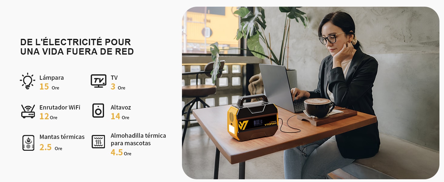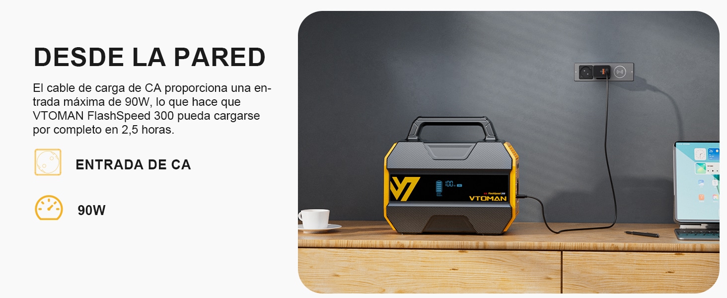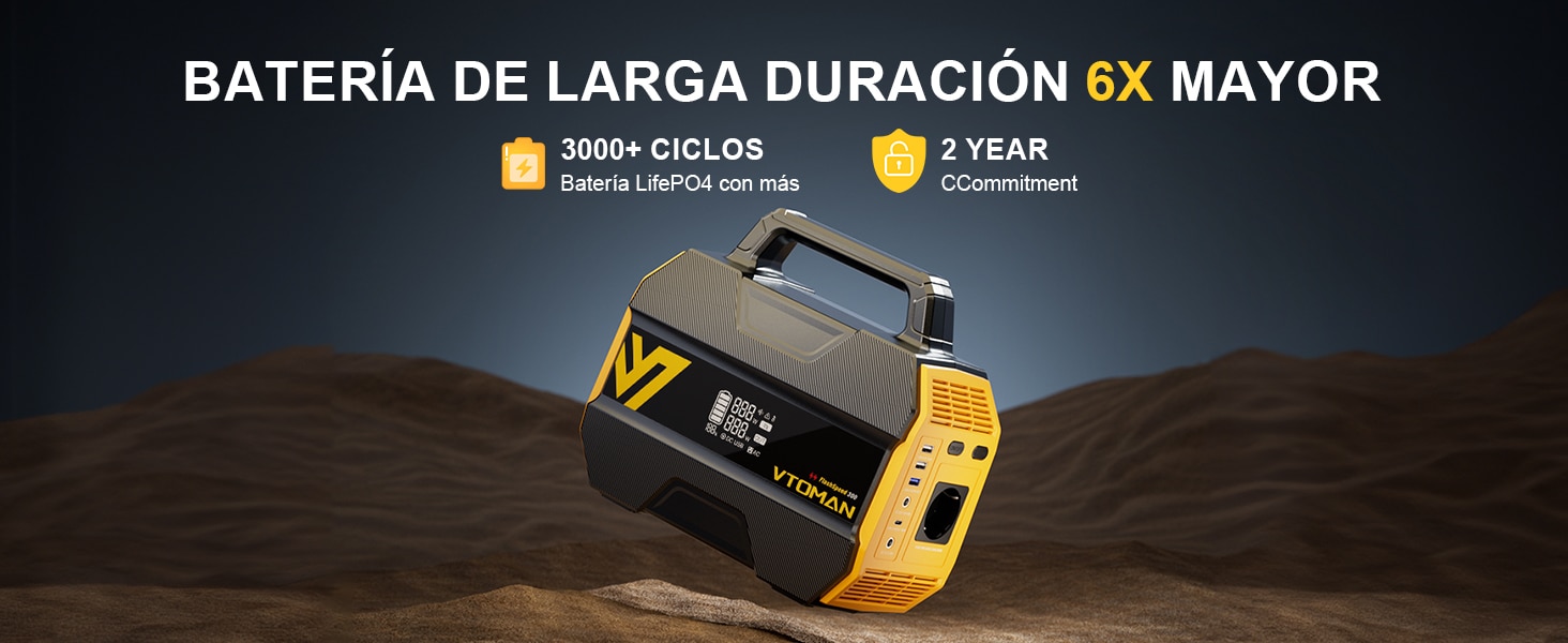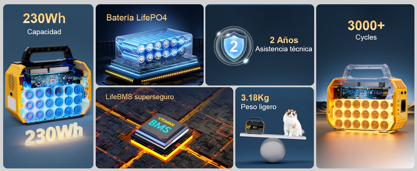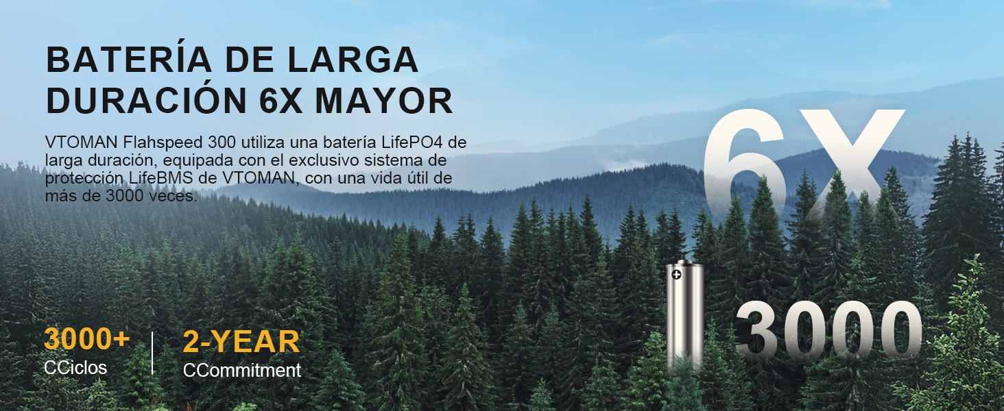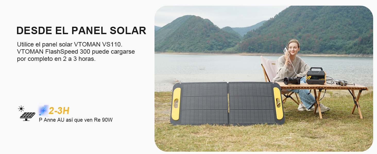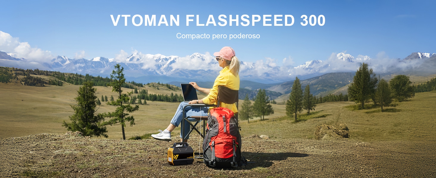 【Estación de Energía a Batería LifePO4 Supersegura】Diseñada con el sistema de protección LifeBMS superseguro de VTOMAN, la estación de energía portátil FlashSpeed 300 tiene protección contra sobrecarga, sobredescarga, sobretensión, sobrecorriente, cortocircuito y hasta 10 tipos de protección. Además, gracias a la batería LiFePO4(LFP) incorporada, la estación de energía portátil FlashSpeed 300 de VTOMAN es más resistente al calor y más segura en comparación con las estaciones de batería NCM.【Batería LFP de Larga Duración de 3.000 Ciclos】La estación de energía a batería FlashSpeed 300 utiliza una batería LiFePO4(LFP) que tiene 3.000 ciclos completos de vida útil antes de alcanzar el 80 % de su capacidad original, lo que equivale a hasta 10 años de vida útil, lo que le proporciona suficiente energía para sus necesidades tanto en exteriores como en interiores.【Carga Rápida】La estación de energía solar portátil VTOMAN FlashSpeed 300 está equipada con un adaptador de CA de 90 W máx, la carga completa demora solo 2,5 Horas. También puede cargarla de otras 3 formas: cargador de automóvil / panel solar (se vende por separado) / puerto USB-C (100 W PD).【Salida Tipo C PD de 100W】La estación de energía VTOMAN FlashSpeed 300 tiene 3 puertos USB-A y 1 puerto tipo C. Los puertos tipo C pueden proporcionar una carga rápida de 100 vatios máx. para sus dispositivos eléctricos, perfecta para trabajadores de oficina con computadoras portátiles; El puerto de carga USB-A de 5V / 9V / 12V, con una potencia de salida máxima de 18W, es ideal para cargar teléfonos inteligentes, tabletas, etc.【Carga de 6 Dispositivos Simultáneamente】El generador solar portátil de batería VTOMAN FlashSpeed 300 tiene 6 puertos de salida en total que pueden funcionar simultáneamente, incluidos 1 tomacorriente de CA de 230 V/300 W (Sobretensión de 600 W), 3 puertos USB-A, 1 puerto USB-C y 1 puerto de salida DC5521. Además, la luz de camping de 3 modos puede proporcionarle iluminación de emergencia.【Estación de Energía Portátil Compacta】La estación de energía portátil VTOMAN FlashSpeed 300 pesa solo 3,18 kg y, después de miles de pruebas de ergonomía, además del diseño del mango, tiene una excelente comodidad y portabilidad, ideal para exteriores, campamentos, viajes, pesca, trabajos remotos o emergencias.【Lista de Paquetes】1x estación de energía portátil VTOMAN FlashSpeed 300, 1x adaptador de CA y cable de carga, 1x cable de encendedor de cigarrillos del vehículo, 1x Cable USB-C a USB-C, 1x Cable USB-A a Tipo-C, 1x Manual de usuario.