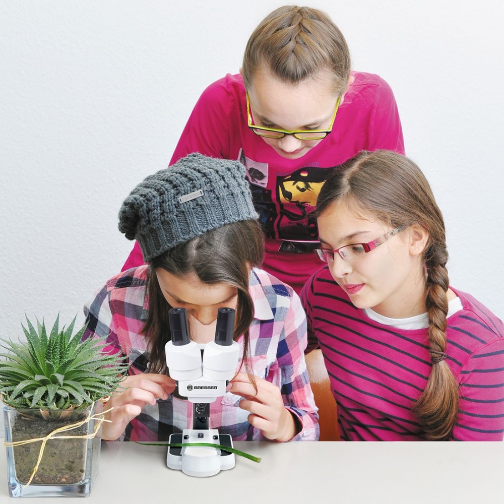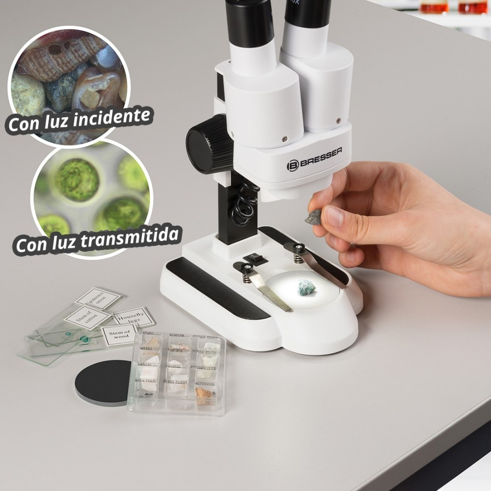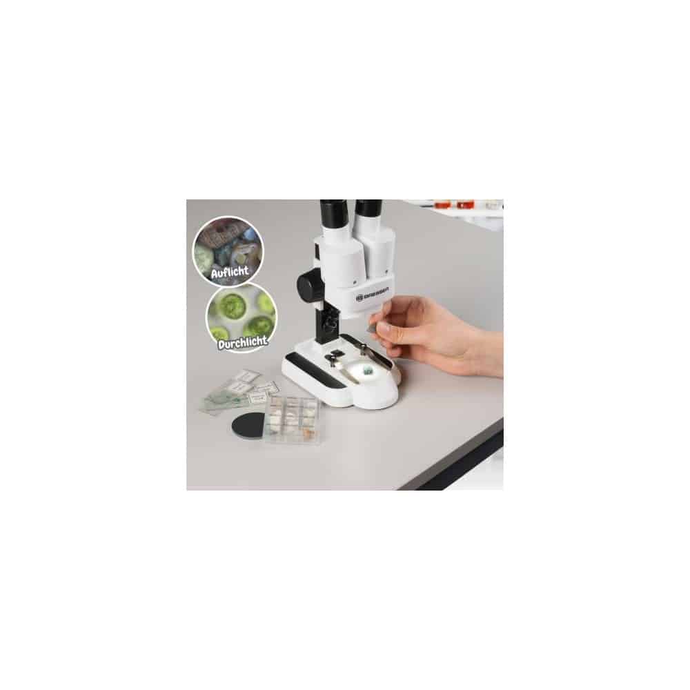 BRESSER JUNIOR – Jugando y descubriendo el fascinante mundo de la microscopía. Dos ojos ven más que uno. Podrás ampliar 50 veces muchos de tus objetos encontrados con este microscopio estereoscópico! Enciende la luz, sitúa tu prueba y observa! Con este microscopio para niños está regalando mucho más que un juguete: fomenta el trabajo científico de los niños estimulando al mismo tiempo su espíritu descubridor. A la pregunta, de qué están hechas algunas cosas, los niños podrán responder de manera autónoma a sus preguntas y descubrir cómo funciona el mundo del microcosmos: observe objetos cuotidianos como por ejemplo monedas, piedras, insectos y también preparados que ya se encuentran incluidos en el set.