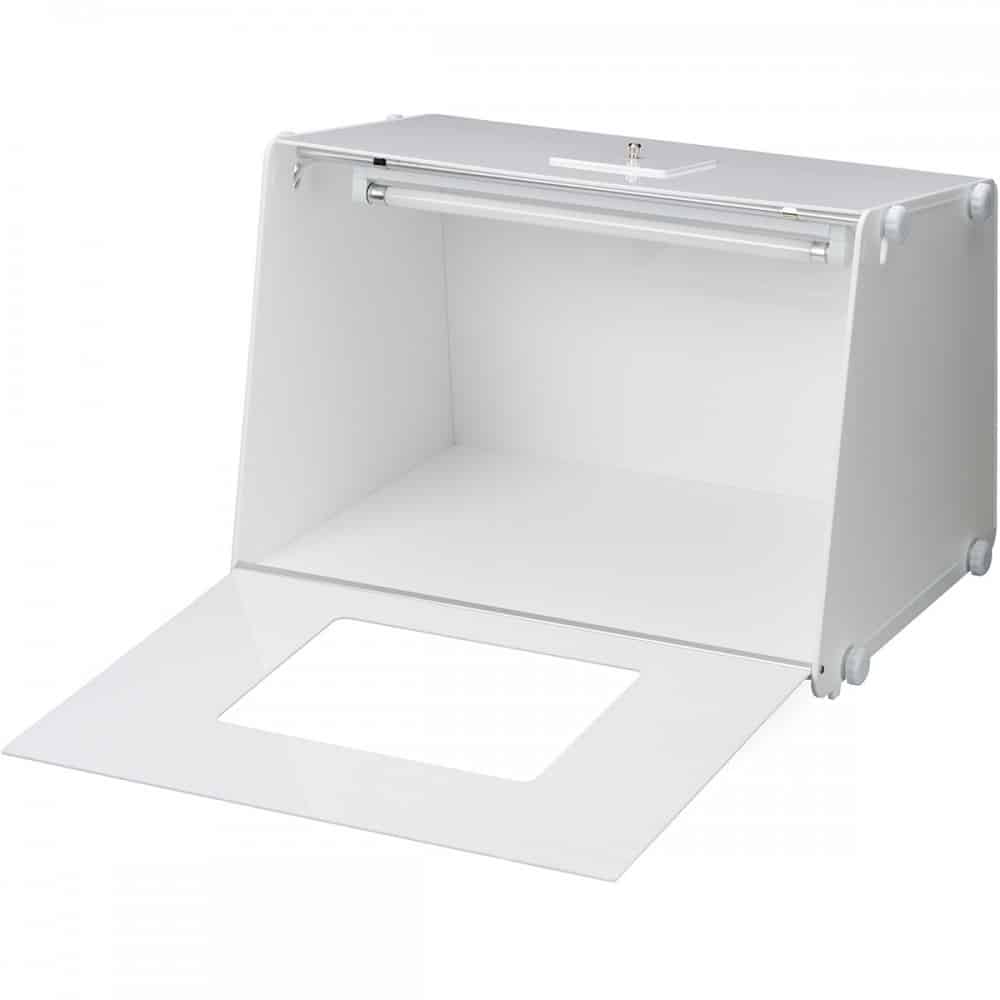 Con esta práctica caja de fotografía puede realizar perfectas fotografías de productos al primer intento! Las difusas, paredes de color blanco lechoso reducen los reflejos cuando se realizan las fotografías de los productos. Integrada en la caja, hay una lámpara de luz diurna que proporciona una agradable y uniforme iluminación. Tiene aberturas en la parte superior y frontal para que pueda realizar las fotografías.