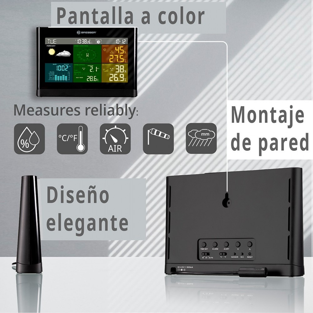 El nuevo Centro meteorológico BRESSER 5-en-1 Confort con pantalla en color combina de una manera única un diseño compacto con una amplia información meteorológica. Su sensor exterior multifunción, concebido con un diseño compacto, puede situarse en casi cualquier lugar sin precisar mucho espacio. Incluidas en la entrega, encontrará una abrazaderas de tubo y roscas (diámetro de las roscas 25-33 mm aprox.) para que pueda montarlo en mástiles así como un pie abatible para su montaje en superficies llanas.