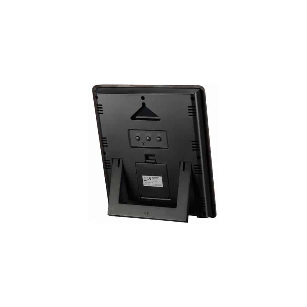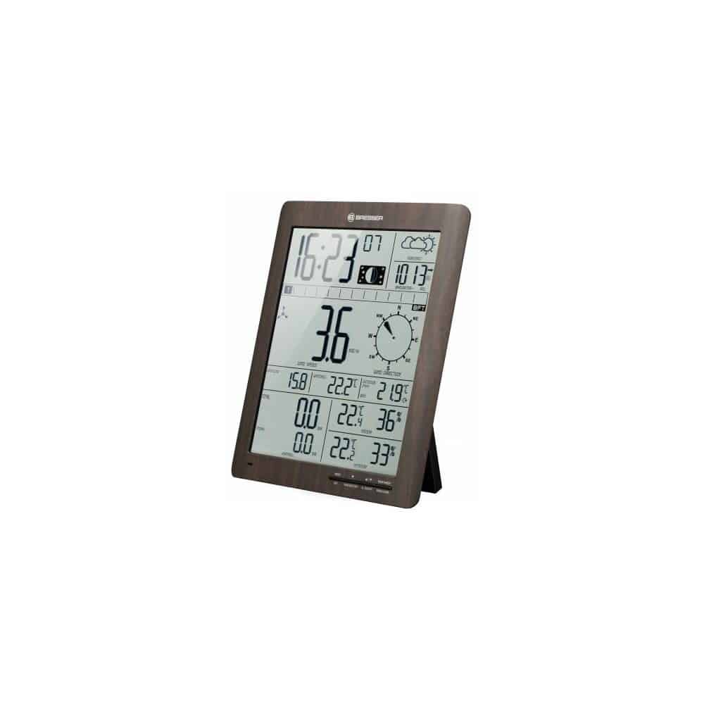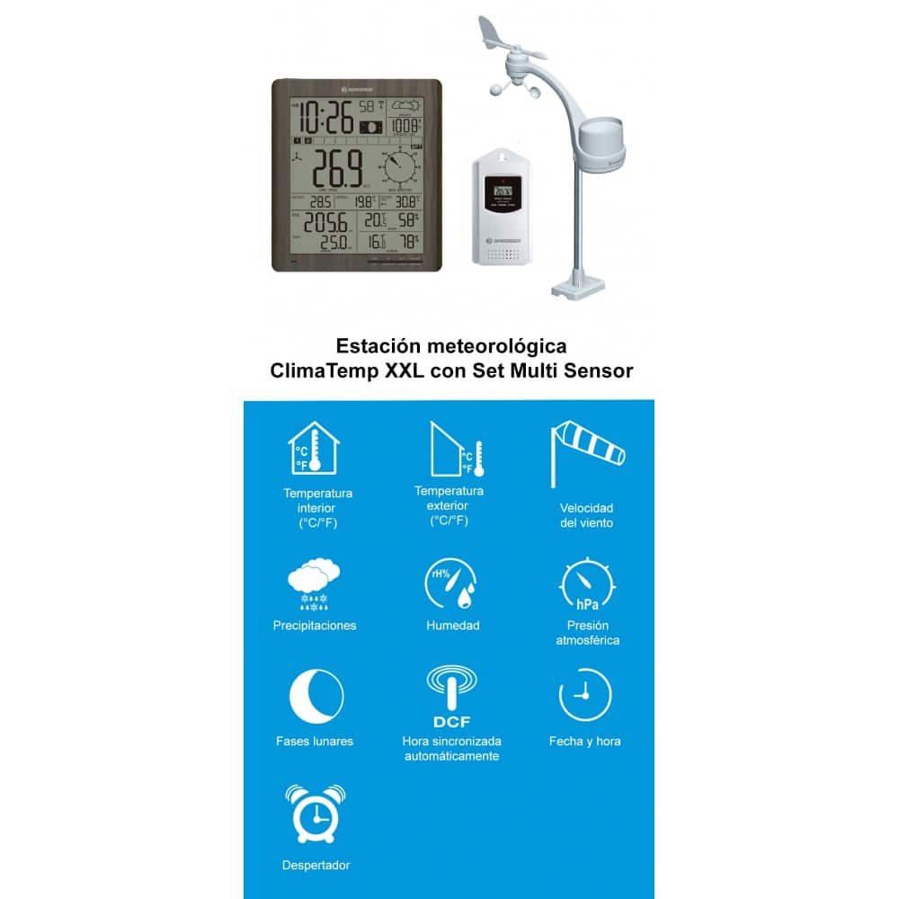 Centro Meteorológico ClimaTemp XXL con apariencia de madera. Muestra la temperatura, la humedad, la precipitación, la presión atmosférica, el viento, fecha y hora. La precipitación se indica en mm para las últimas 24 horas y los últimos 30 días. Los datos del viento se dividen en fuerza del viento (escala 1-12), la velocidad del viento es medida en km/h, la sensación térmica en C°/F.