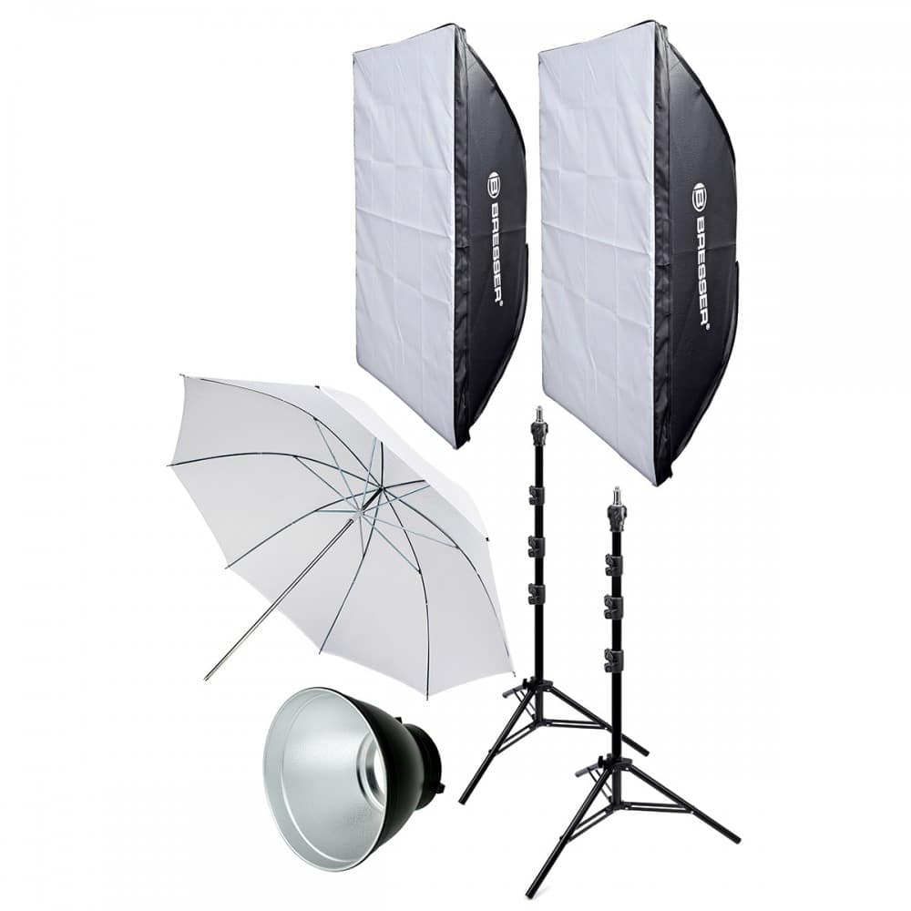 Este completo conjunto de accesorios para flashes de estudio puede conectarse a todas las luces de flash de estudio BRESSER así como para otras marcas que tengan una montura de Bayoneta Bowens S.