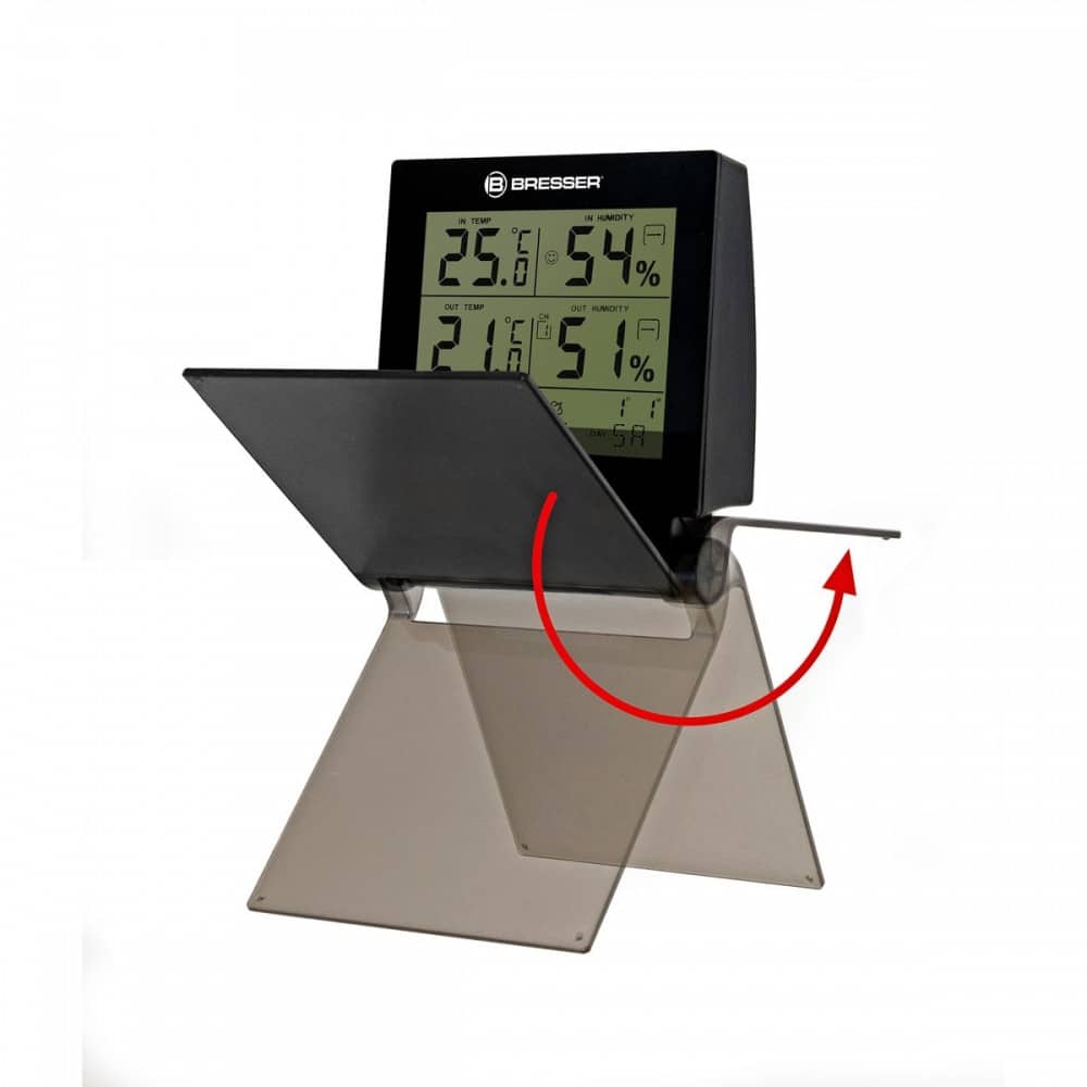En la pantalla compacta se puede ver información sobre la temperatura y la humedad para el interior y exterior, así como la tendencia del higrómetro. El clima actual de la habitación se ilustra con un icono (demasiado seco, óptimo, demasiado húmedo). La hora actual, la fecha y el día de la semana se ajusta automáticamente mediante una señal de radio.