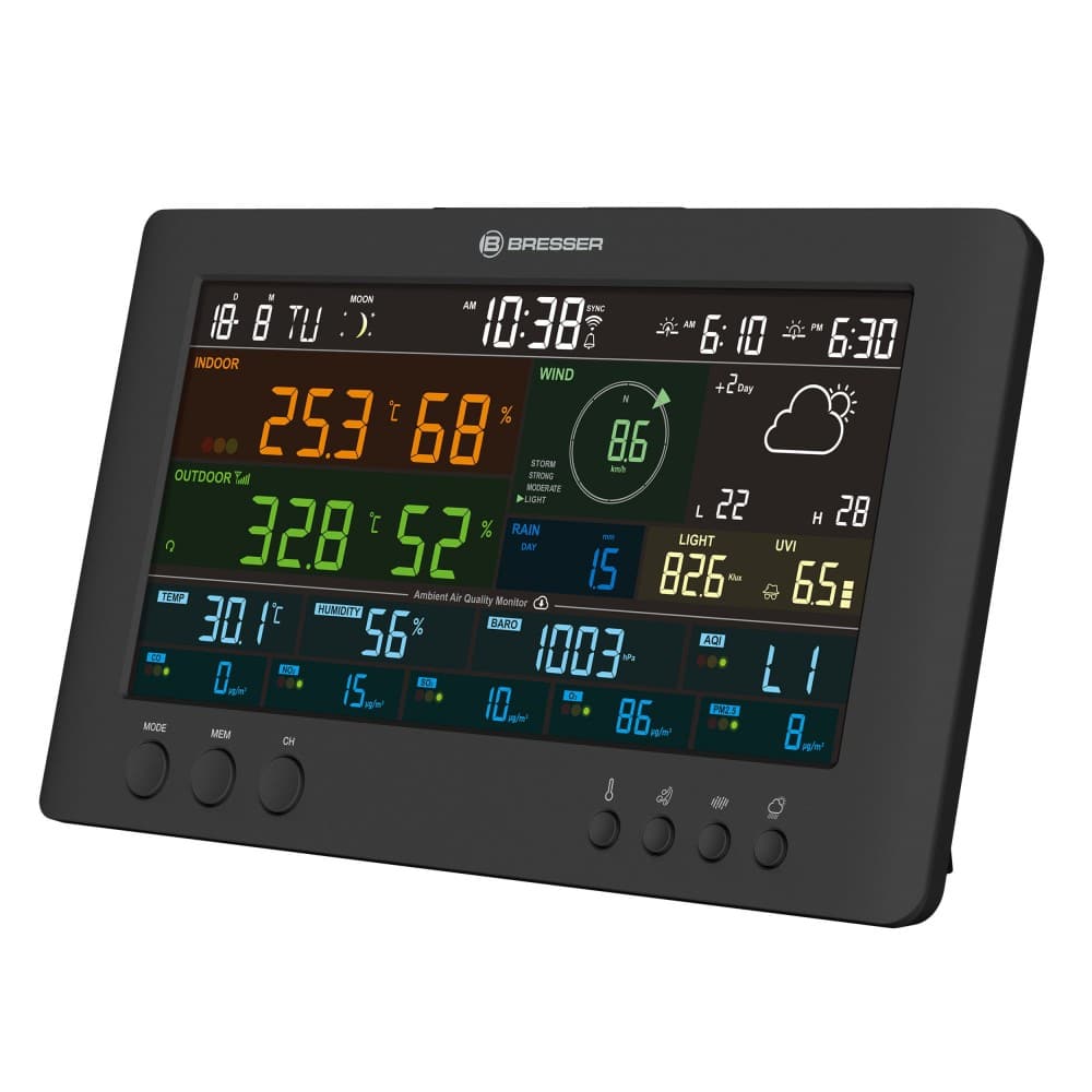 Grandes perspectivas para los aficionados al aire fresco ofrece el BRESSER 7-en-1 Estación Meteorológica Air-Mon. Porque para su hogar, la estación meteorológica moderna, incluyendo aplicación y pantalla a color, combina datos meteorológicos medidos localmente con valores actuales de calidad del aire de Internet.