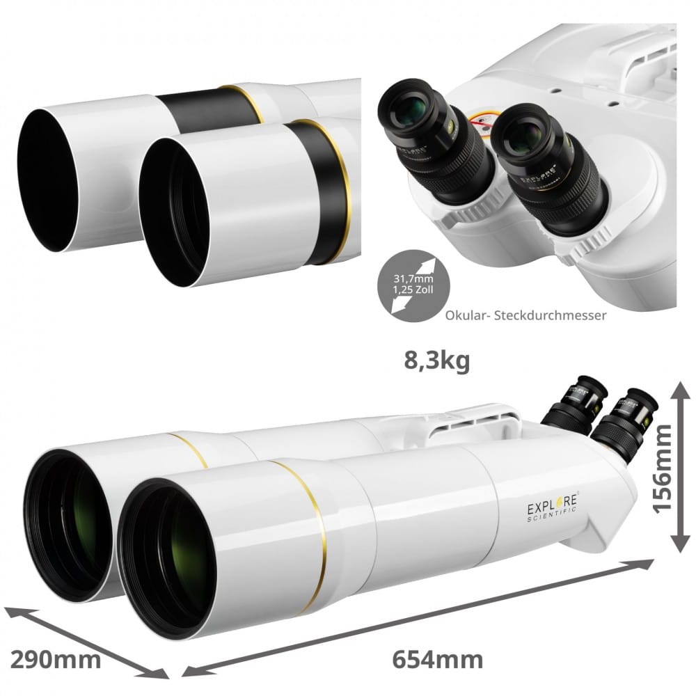 Los prismáticos de la serie BT están diseñados para un uso intensivo en exteriores. El diseño sellado IPX6 y lleno de nitrógeno evita eficazmente que se empañe la óptica interna incluso en condiciones meteorológicas difíciles. La carcasa de magnesio, muy ligera, ahorra peso y facilita su manejo. Dos oculares EXPLORE SCIENTIFIC de 20 mm de la serie LER de 62 grados ya incluidos. EXPLORE SCIENTIFIC es un fabricante consolidado de oculares de altísima calidad en el ámbito de la astronomía. Un sistema óptico es tan bueno como lo sea su componente más débil. Por esta razón entregamos estos prismáticos gigantes con un par de oculares de calidad de la serie LER de 62 grados. Con un campo de visión aparente de 62 grados y una distancia focal de 20 mm, los prismáticos BT-120 producen un aumento de 33x. Así, estos oculares gran angulares ofrecen una muy buena visión general (campo de visión de 1,8 grados) con un aumento moderado. La gran distancia interpupilar de estos oculares LER (long eye relief) de 15 mm y las suaves copas oculares de silicona, que se pueden girar al revés, también garantizan una visión cómoda y relajada. Para su uso en astronomía, su campo de imagen plano y nítido es una ventaja y ofrece una experiencia de visualización particularmente impresionante incluso durante el día. Gracias al diseño impermeable y al relleno de argón, estos oculares son absolutamente duraderos y fáciles de limpiar.