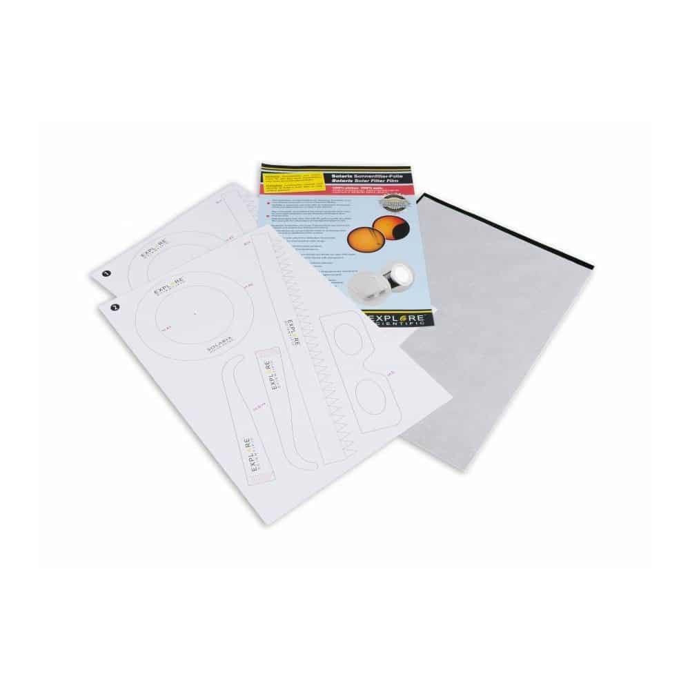 Es una película en formato folio A4 que puedes recortar para hacer el filtro solar del tamaño adecuado para tus telescopios, binoculares, cámaras de foto y video.
