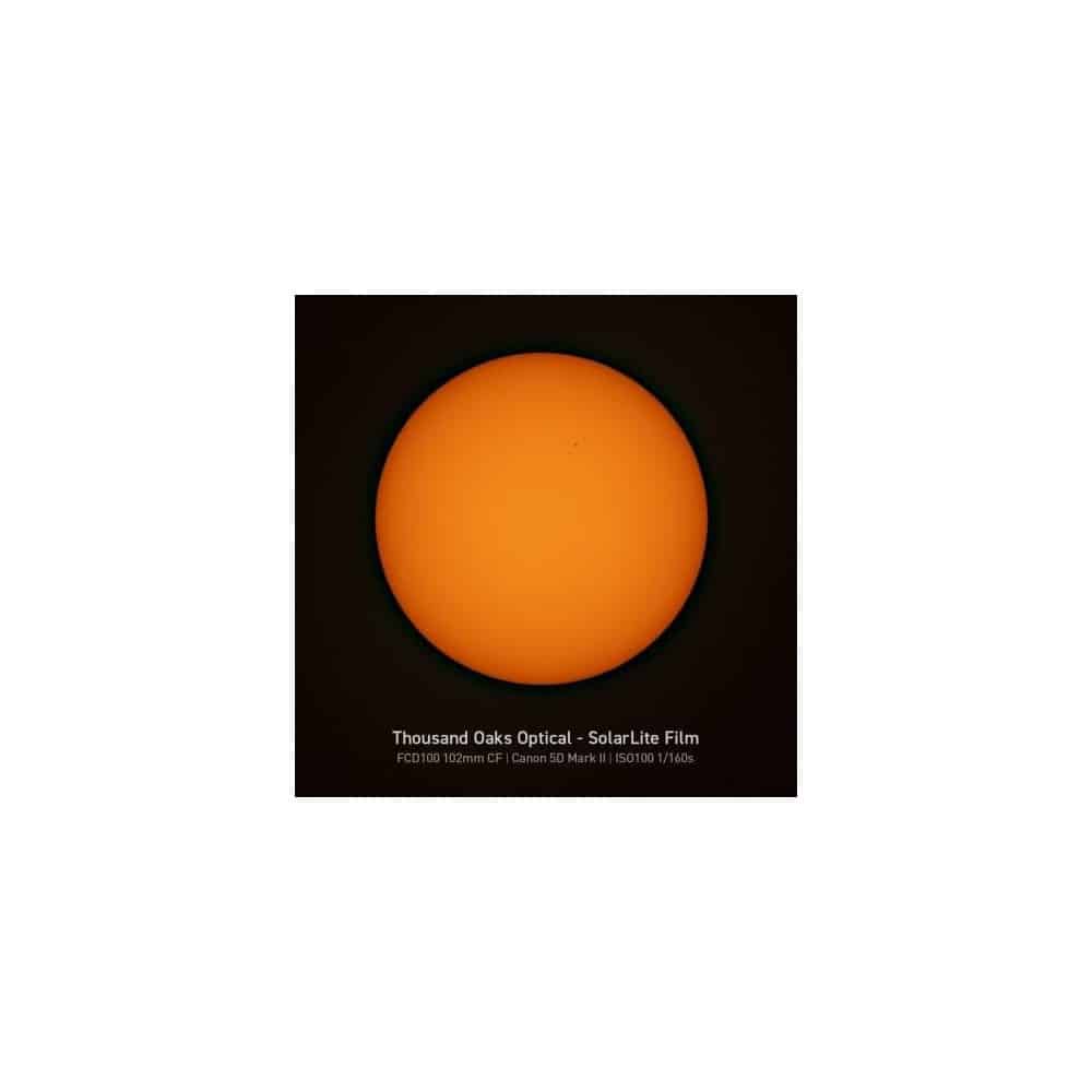 La lámina especial Solarlite se fabrica en Estados Unidos por la conocida empresa Thousand Oaks Optical y le garantiza, mediante su certificado ISO12312-2, un uso absolutamente seguro. Con este producto, Solarlite aúna las ventajas ópticas de un filtro solar de cristal de alta calidad con la robustez de una lámina de filtro de polímero.
