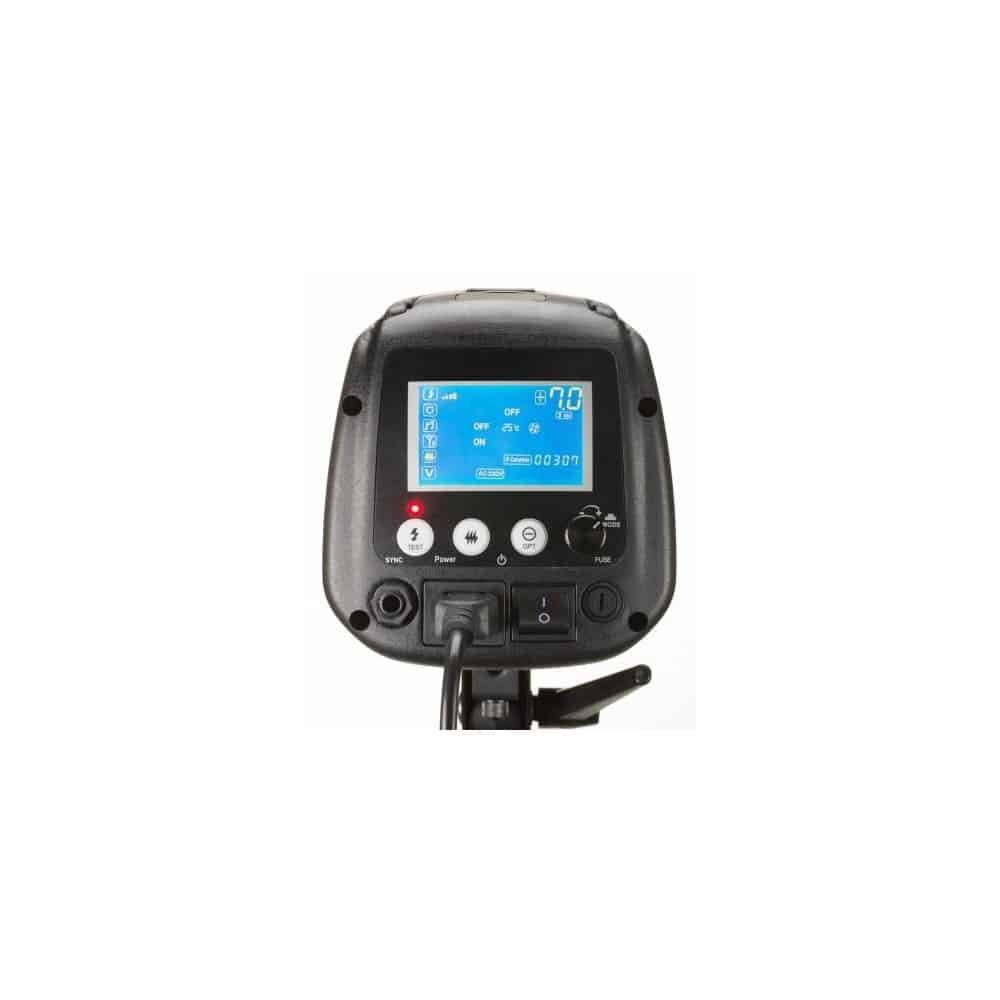 Gran pantalla LCD con control de programa digital, indicador de encendido, número de guía (GN), función de sobrecalentamiento o sobretensión.