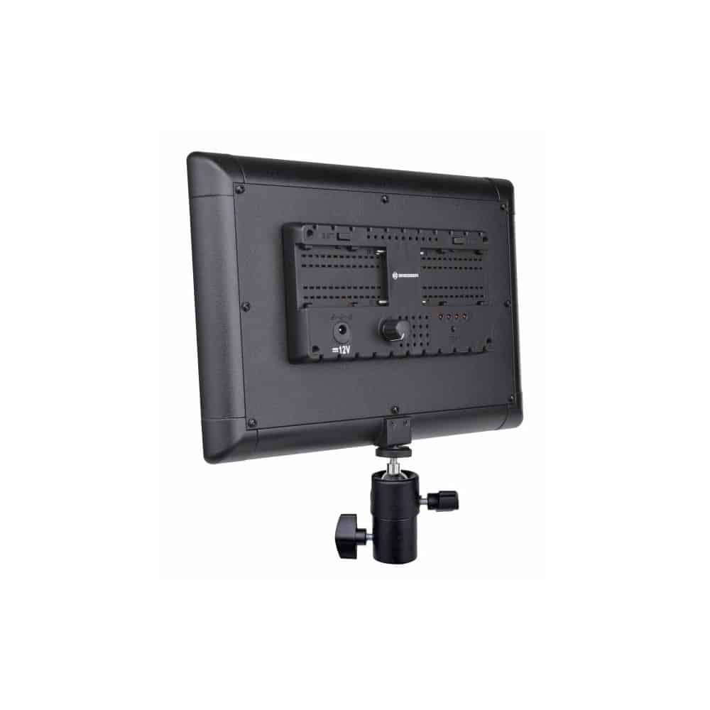 Las lámparas LED BRESSER son muy buenas para usar en retratos y fotografías de productos. La temperatura de color de 5600 K puede compararse con la luz diurna. Con el filtro de difusión es posible una iluminación con efecto reflector incluso desde una distancia cercana. Gracias al cierre magnético el filtro se puede cambiar fácilmente. Una ventaja importante de las bombillas LED es que no se calientan y por tanto pueden usarse sin riesgo por un largo tiempo. El promedio de vida de una lámpara LED es de 50.000 horas de funcionamiento. La intensidad de la luz es infinitamente variable y la lámpara puede funcionar a través de un cable de red o con una batería de litio NP-F550 opcional. Totalmente cargada el tiempo de funcionamiento de la batería es aproximadamente de 2 horas. En la parte inferior de la lámpara LED hay una articulación de rótula con la que se puede dirigir a cualquier posición deseada.