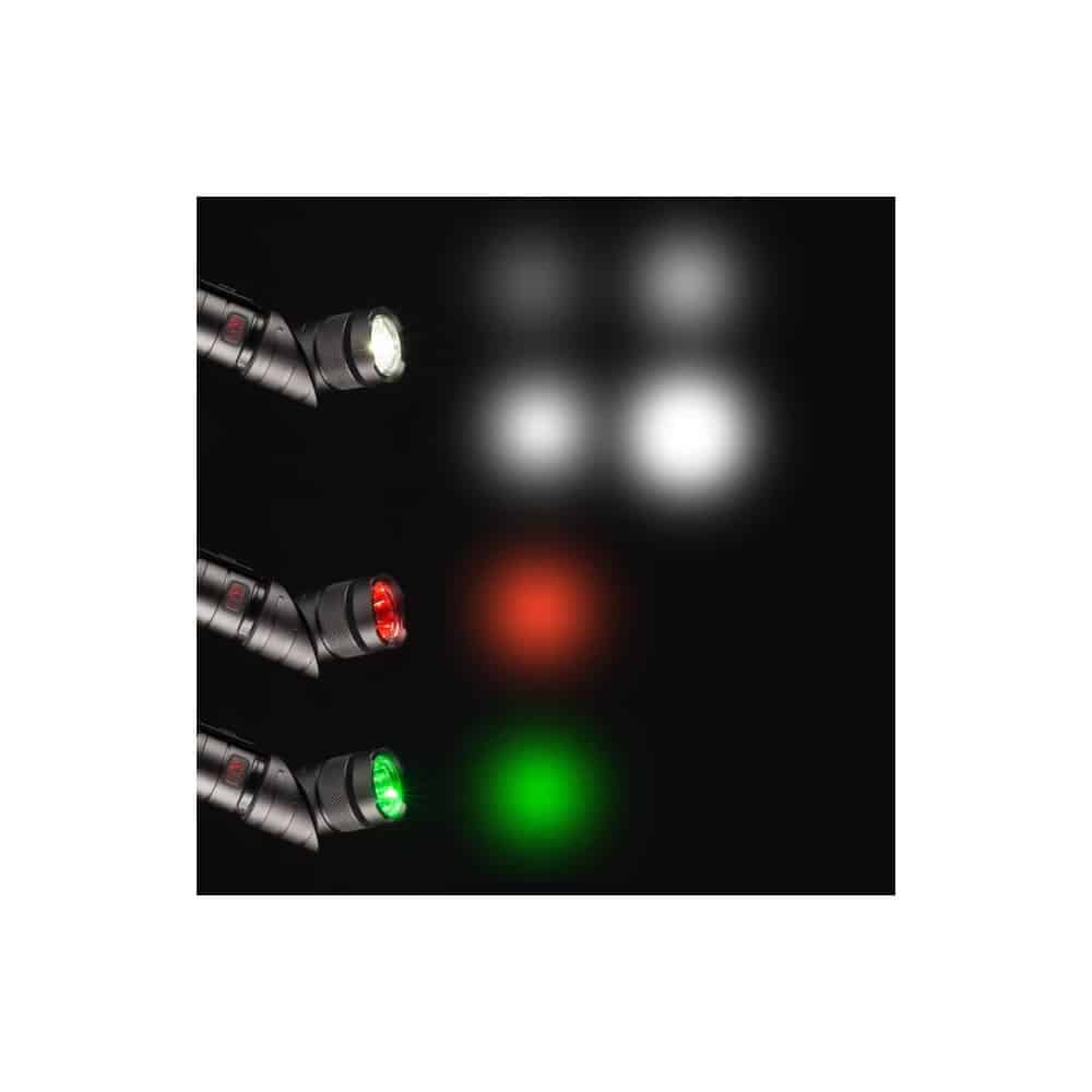 ¡Ilumine bien sus excursiones con luz roja, blanca o verde utilizando la linterna en ángulo recto!