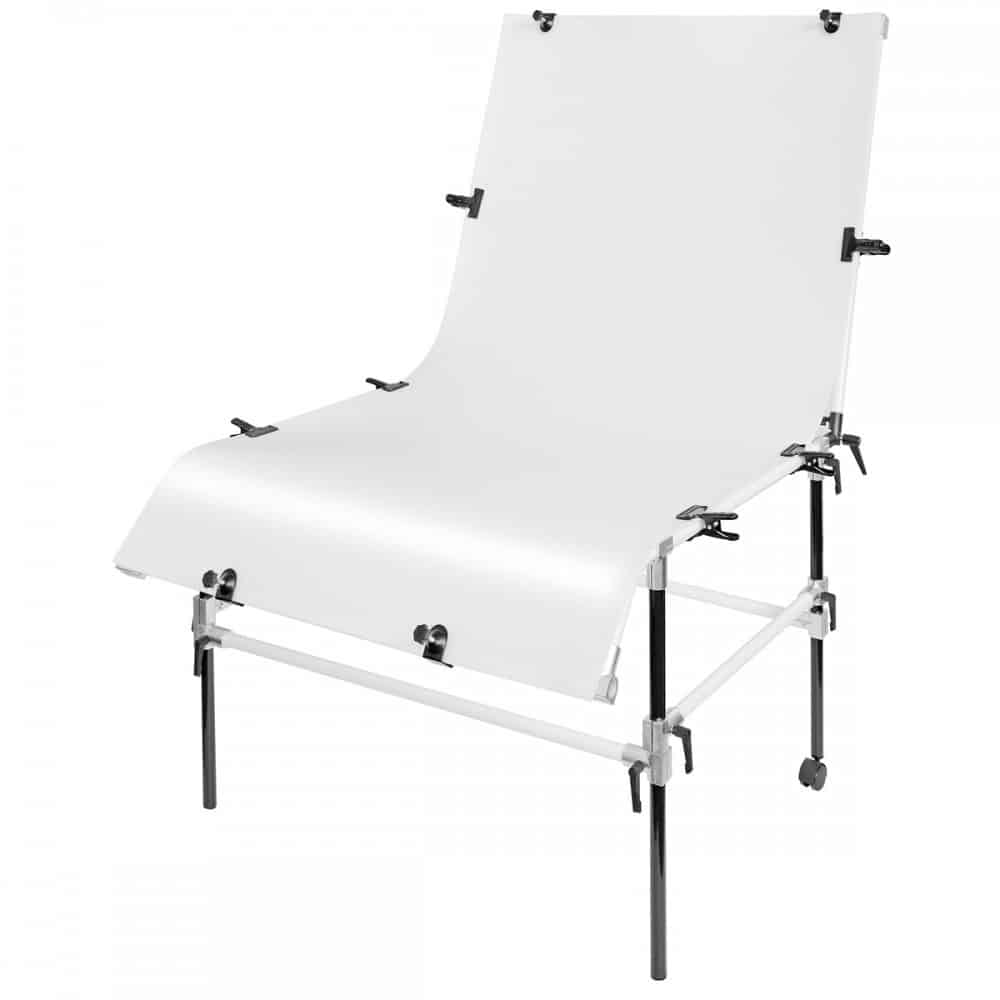 Multifuncional y precisa mesa profesional de fotografía ideal para fotografiar productos. Mesa de fotografía perfecta para todas las situaciones que se producen en el estudio. El marco tiene una capacidad de carga de 75 kg. Los componentes y elementos de conexión están hechos de aluminio fuerte. Con las dos ruedas en las patas traseras se puede mover fácilmente. Todas las herramientas de las lámparas pueden fijarse al marco para que el sujeto este excelentemente iluminado. Junto con la mesa para sesión fotográfica viene una lámina gruesa y estable hecha de plexiglás con un lado brillante y otro mate. Esta lámina tiene una capacidad de carga máxima de 25 kilos. La lámina de 130 x 240 cm se fija a la mesa usando los soportes. El marco de aluminio es fácil de montar. La altura de trabajo es de 75 cm , la profundidad de la mesa es 125 cm.