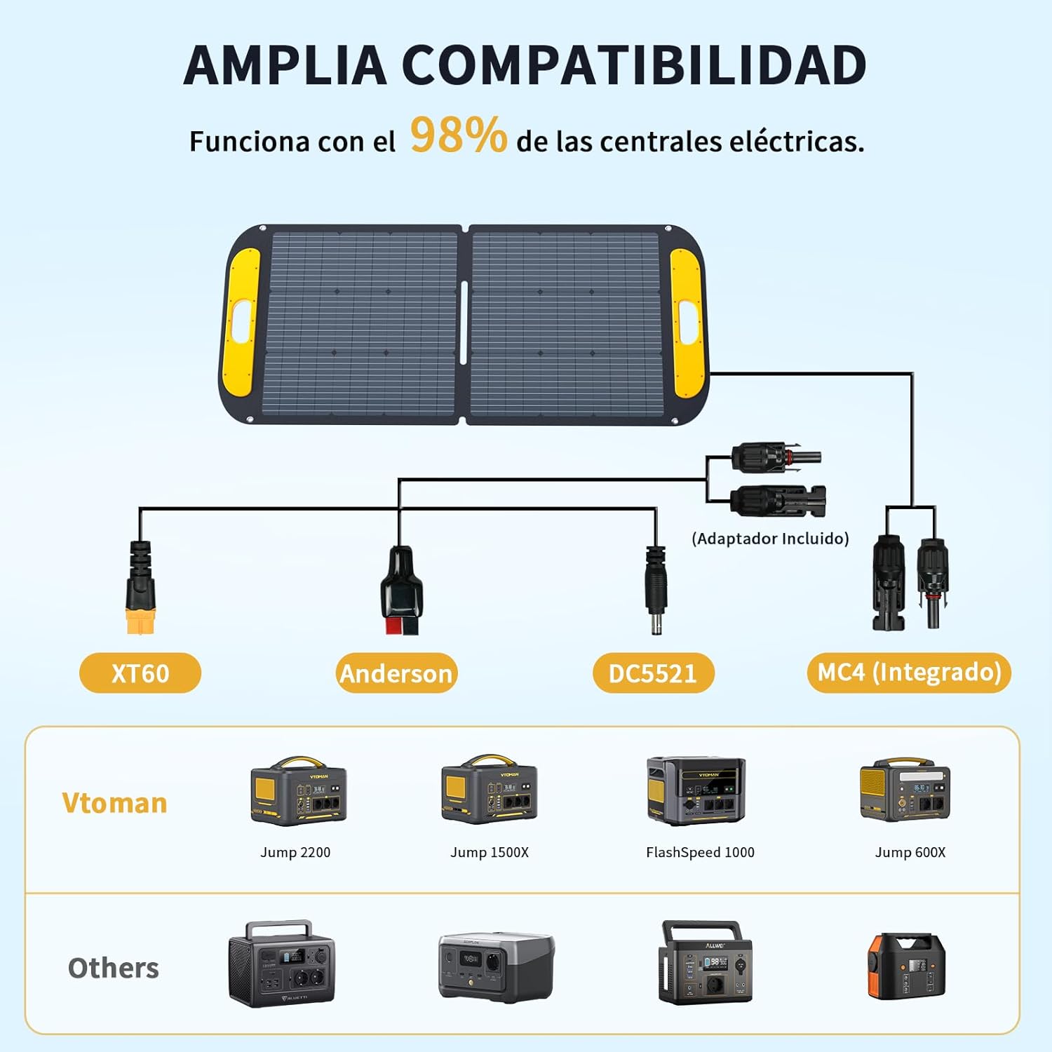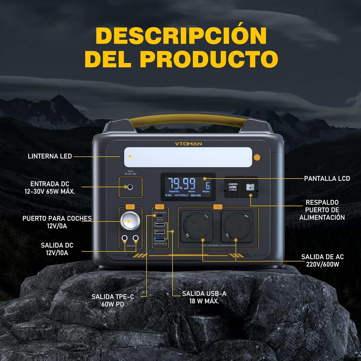 【Estación Eléctrica Portátil SuperSafe LIFEBMS】La VTOMAN Jump 600X estación eléctrica portátil tiene un sistema de protección SuperSafe LIFEBMS desarrollado por VTOMAN, que proporciona hasta 10 funciones de protección de la batería, tales como sobrecarga, sobredescarga, sobretensión, sobrecorriente, cortocircuito, alta temperatura. Además, gracias a la batería LiFePO4 incorporada, la central eléctrica portátil VTOMAN Jump 600X es más resistente al calor y mucho más segura en comparación con la central eléctrica de batería NCM.【Capacidad Ampliable a 939Wh】VTOMAN Jump 600X estación de energía portátil tiene una capacidad de 299Wh, La batería adicional Jump 600X (se vende por separado) es adecuado para Jump 600X Estación de Energía Portátil, por lo que puede ampliar la capacidad de Jump 600X Estación de Energía Portátil a 939Wh. Podrá alimentar sus dispositivos durante más tiempo. Además, la batería LiFePO4 de alta calidad incorporada aún conserva el 80% de su capacidad original después de 3000 ciclos, lo que la hace muy duradera.【600W Fuente de Alimentación Constante】VTOMAN Jump 600X estación de energía portátil con 2 tomas de CA para una potencia nominal de salida de 600W (picco de 1200W). Además, la estación de energía portátil Jump 600X también emite 600 vatios de potencia constante cuando se ejecutan dispositivos de más de 600W en lugar de apagar su alimentación. Le proporciona una solución de reserva alternativa cuando alimenta aparatos de más de 600W, como calentadores de agua, calefactores, hornos, etc.【600W Fuente de Alimentación Constante】VTOMAN Jump 600X estación de energía portátil con 2 tomas de CA para una potencia nominal de salida de 600W (picco de 1200W). Además, la estación de energía portátil Jump 600X también emite 600 vatios de potencia constante cuando se ejecutan dispositivos de más de 600W en lugar de apagar su alimentación. Le proporciona una solución de reserva alternativa cuando alimenta aparatos de más de 600W, como calentadores de agua, calefactores, hornos, etc.【PD 60W Tipo C Salida】VTOMAN Jump 600X estación de energía portátil tiene múltiples salidas USB, incluyendo 3× puertos USB-A y 1× salida Tipo C. El puerto Tipo-C puede proporcionar una carga rápida de 60W máx para sus dispositivos eléctricos, perfecto para los trabajadores de oficina portátil. Los puertos USB-A incluyen un puerto de carga rápida QC 3.0 con una salida máxima de 18W, ideal para alimentar smartphones, tablets, etc.【Cargue hasta 9 Dispositivos Simultáneamente】Jump 600X estación de energía portátil tiene una salida completa, incluyendo 2×230V/600W AC outlet, 2×12V/10A DC5521 salida, 1×12V/10A auto port, 3×USB-A salida y 1×TYPE-C PD60W salida. Puede cargar hasta 9 dispositivos simultáneamente mientras carga (soporta carga pass-through) y ¡ahorra espacio en la pared! Ideal para acampadas, viajes, autocaravanas, emergencias y apagones.【Muchos Métodos de Carga Diferentes】VTOMAN Jump 600X estación eléctrica portátil tiene un conector de entrada DC5521(5.5mm×2.1mm) que soporta 65W Max potencia de entrada. Se puede cargar de tres maneras: (1) Carga con el cargador de pared (incluido): Aprox. 5 horas; (2) Carga por enchufe de coche (cargador de coche incluido): Aprox. 5 horas; (3) Carga mediante panel solar de 110W: Aprox. 6-8 horas. [Placa :tasa de conversión de energía alta del 23%] Fabricado con células solares de silicio monocristalino, el panel solar portátil Vtoman VS110 puede absorber mejor la energía solar con una eficiencia de conversión de hasta el 23% en comparación con otros paneles convencionales.[Compatible y versátil] El panel solar portátil VTOMAN VS110 tiene una interfaz universal incorporada que funciona con la mayoría de los sistemas de energía. También viene con un adaptador 3 en 1 para convertir la interfaz en interfaces Anderson/XT60/DC5521, que son compatibles con la mayoría de las estaciones de energía en el mercado.[Configuración rápida y fácil] El panel solar Vtoman VS110 viene con 2 soportes ajustables para una configuración rápida en el suelo. También cuenta con 4 agujeros circulares para colgarlo fácilmente en el aire, como en balcones y vehículos recreativos.[Plegable y portátil] Los paneles solares VTOMAN VS110 se pueden plegar en tamaños más pequeños para facilitar su portabilidad, lo que proporciona más flexibilidad para su uso en exteriores y fuera de la red. El panel solar portátil VS110 mide 65*60 cm cuando está plegado y pesa 5,56 kg.[Clasificación IP67 y resistente a salpicaduras] El panel solar VTOMAN VS110 cuenta con una clasificación IP67 resistente al agua que protege el panel de salpicaduras de agua (Por favor, no lo coloque bajo la lluvia ni lo sumerja en agua).