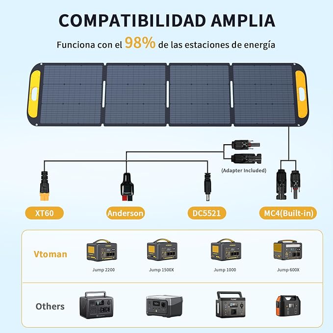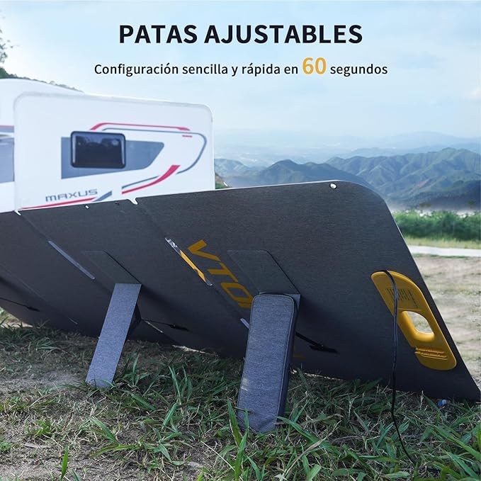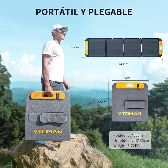[Tasa de conversión de energía alta del 23%] Fabricado con células solares de silicio monocristalino, el panel solar portátil Vtoman VS220 puede absorber mejor la energía solar con una eficiencia de conversión de hasta el 23% en comparación con otros paneles convencionales.[Compatible y versátil] El panel solar portátil VTOMAN VS220 tiene una interfaz universal incorporada que funciona con la mayoría de los sistemas de energía. También viene con un adaptador 3 en 1 para convertir la interfaz a interfaces Anderson/XT60/DC5521, que son compatibles con la mayoría de las estaciones de energía en el mercado.[Configuración rápida y fácil] El panel solar Vtoman VS200 viene con 3 soportes ajustables para una configuración rápida en el suelo. También cuenta con 8 agujeros circulares para colgar fácilmente en el aire, como en balcones y vehículos recreativos.[Plegable y portátil] Los paneles solares VTOMAN VS200 se pueden plegar en tamaños más pequeños para facilitar su transporte, lo que proporciona más flexibilidad para su uso en exteriores y fuera de la red. El panel solar portátil VS200 mide 57*60 CM cuando está plegado y pesa 8,95 KG.[Clasificación IP67 y resistente a salpicaduras] El panel solar VTOMAN VS200 cuenta con una clasificación IP67 resistente al agua que protege el panel de salpicaduras de agua (Por favor, no lo coloque bajo la lluvia ni lo sumerja en agua).[Lo que obtienes] 1*panel solar portátil VTOMAN VS220 de 220W/19V, 1*Adaptador 3 en 1, 1*manual de usuario.El panel solar VS200 también es compatible con las estaciones de energía portátiles Vtoman Jump 600X / Jump 1000 / Jump 1500X / Jump 2200 (se venden por separado), ideal para viajes de camping, viajes por carretera, autocaravanas y overlanding. Nota: El VS220 no está disponible para la serie FlashSpeed de VTOMAN.