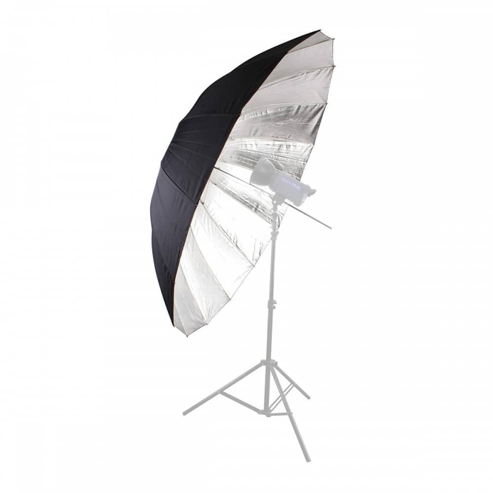 Este super gran paraguas reflector tiene una tela plateada en su interior y el exterior es de color negro opaco. Con un paraguas de este tamaño consigue una dispersión ideal de la luz y una iluminación perfecta.