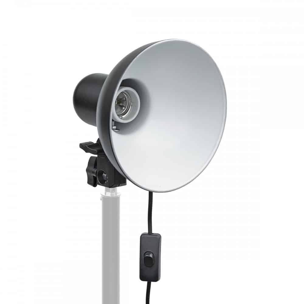 Portalámparas con reflector suave fijo universal compatible para bombillas estándar con casquillo E27. Dispone de un cabezal giratorio para conseguir cualquier posición y es fácilmente adaptable a un trípode por su parte inferior. El reflector fijo le ofrece una iluminación suave. En resumen, un accesorio muy práctico.