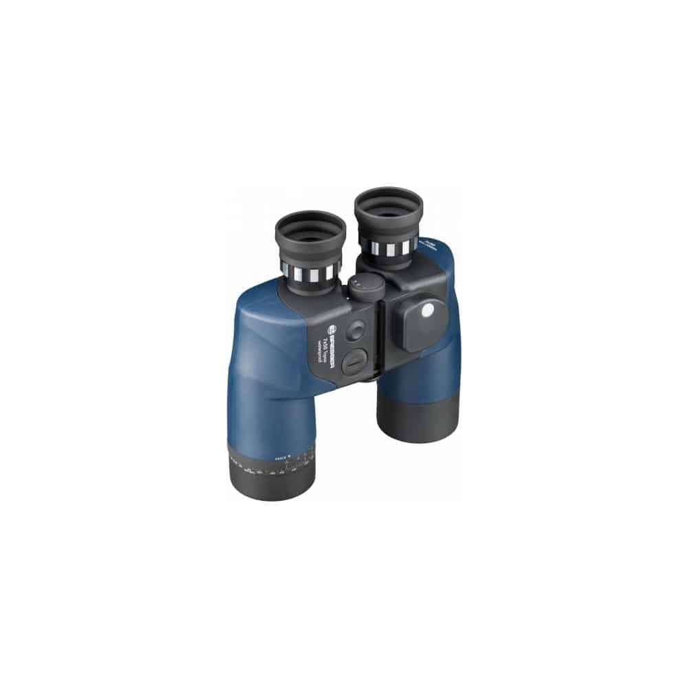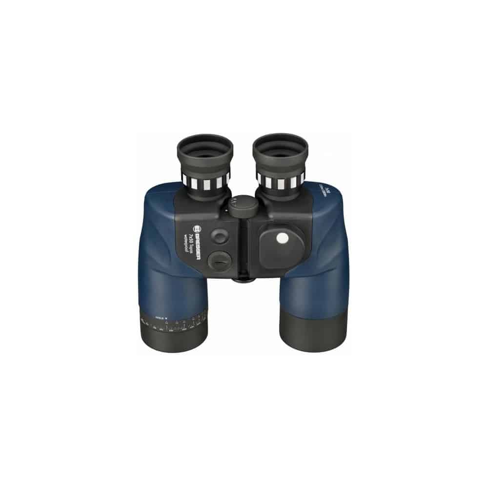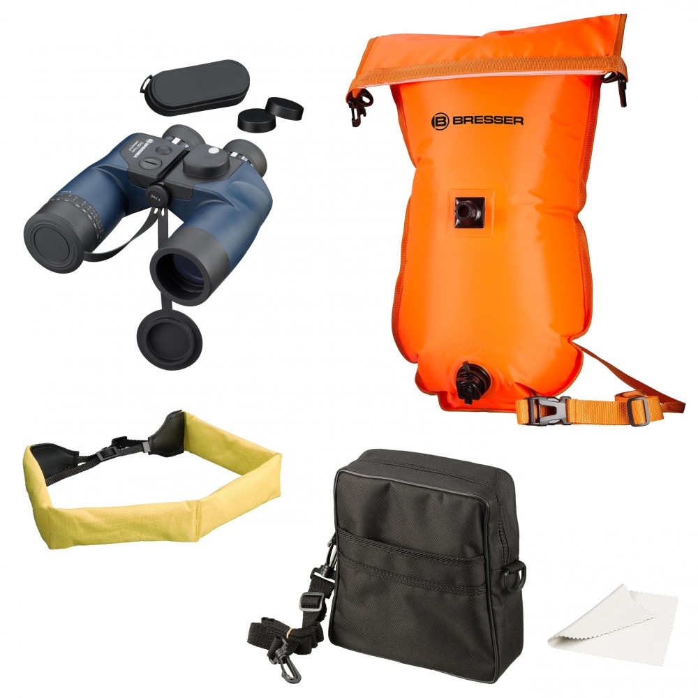 El BRESSER Topas 7×50 es un binocular clásico marino con prisma de porro. El Topas tiene una brújula magnética integrada e iluminada y una retícula para determinar el tamaño o distancia, con el apoyo de un anillo de escala en el adaptador de lente. Los prismáticos son impermeables. Gracias a su carcasa de goma ergonómica tiene un buen agarre y también está protegido contra los choques. El ajuste ocular único le permite ajustar los binoculares una vez configurados para obtener una imagen nítida de todas las distancias náuticas pertinentes. Sus ojeras plegables permiten usar el campo de visión completo también a usuarios con gafas. Mediante el uso de vidrio óptico BAK-4 y un revestimiento multi-capa, siempre ofrece una imagen brillante y de alto contraste. Las tapas de las lentes están fijadas para evitar la pérdida. Están dotados con una rosca para trípodes. Lleva una correa flotante para el caso de que la pieza caiga por la borda.