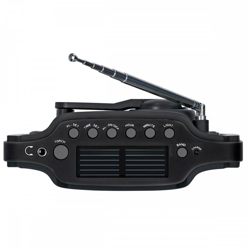 Incluye radio FM/AM, pantalla de tiempo, alarma, fuente de alimentación a través de panel solar o dinamo, batería integrada y capacidad para cargar teléfonos móviles.