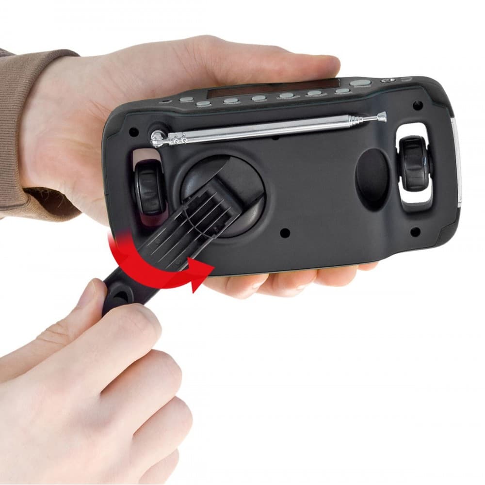 La Radio Solar cuenta con una linterna incorporada y una dinamo. Un puerto adicional le permite que la radio cargue los dispositivos móviles.