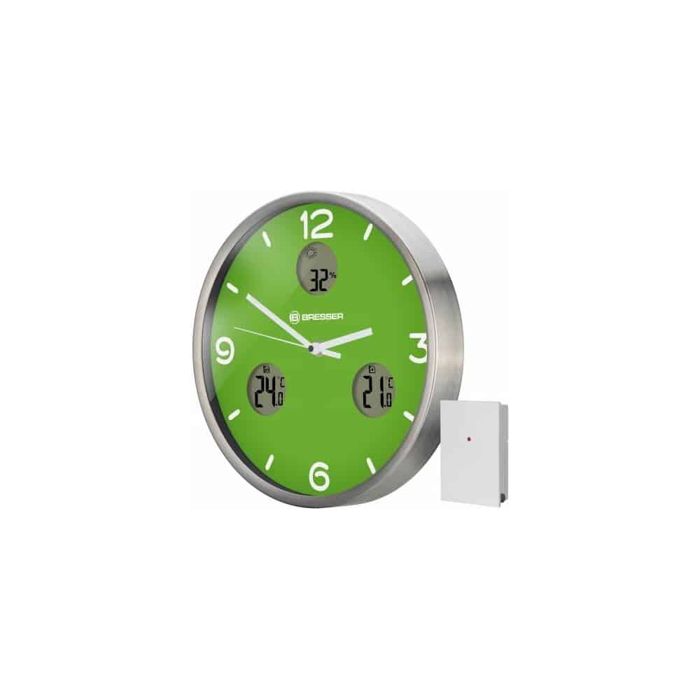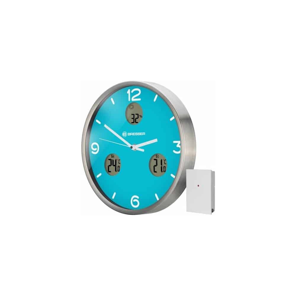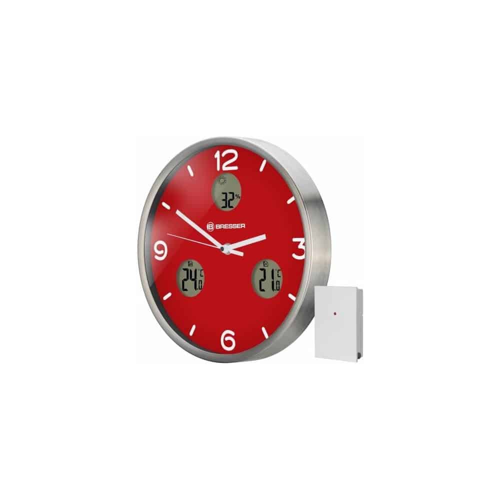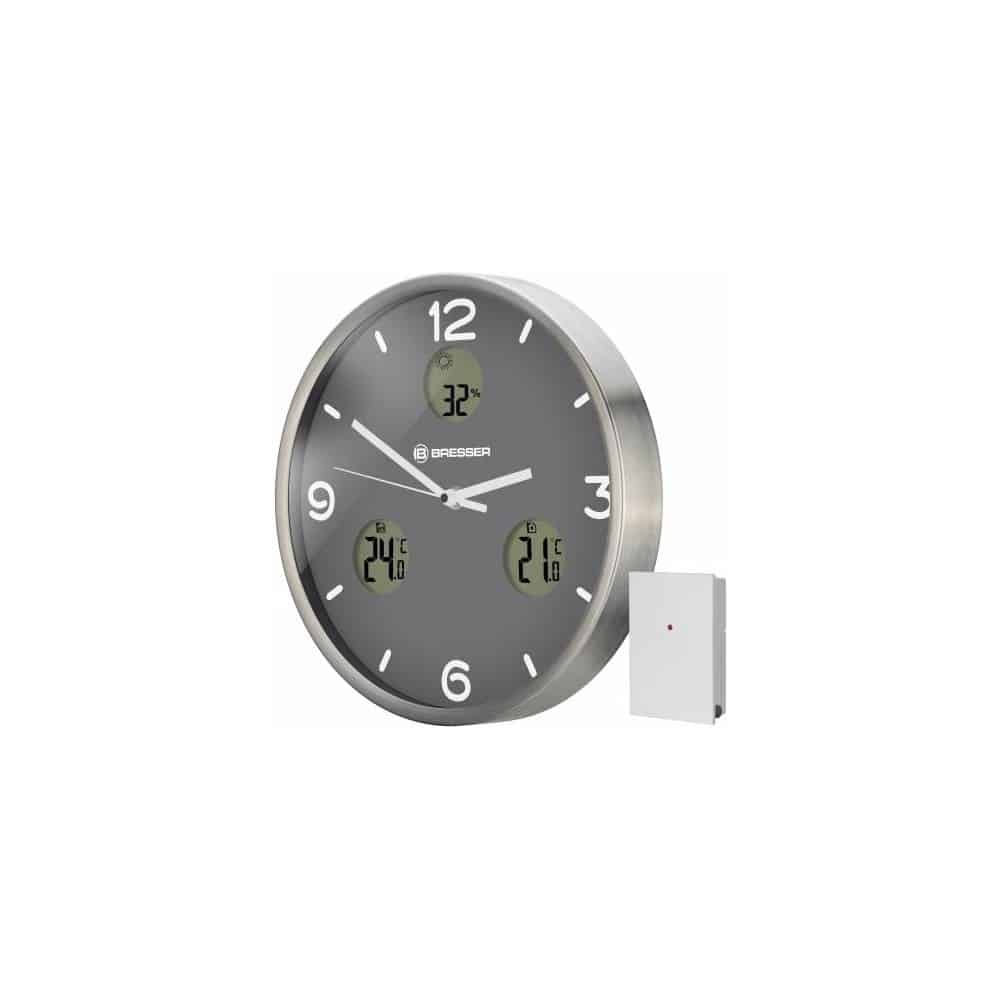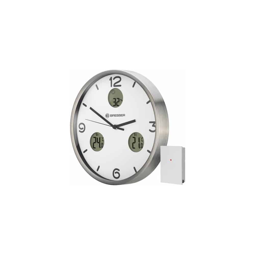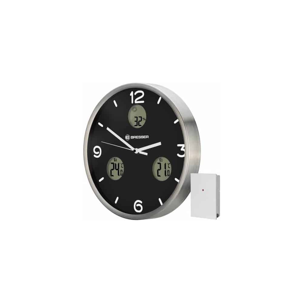 El reloj de pared BRESSER MyTime io muestra, además de la hora controlada por señal DCF, la temperatura interior y exterior, así como la humedad ambiental y una previsión del tiempo. El sensor inalámbrico exterior permite la transmisión de la temperatura exterior hasta un alcance de 30m (en abierto).
