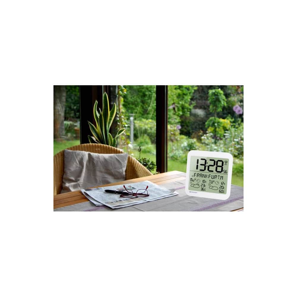 Excepcional en este modelo es su gran pantalla. Podrá leer sin problemas la hora desde una gran distancia. El reloj recibe y reproduce automáticamente la hora recibida por la señal horaria DCF. Sin necesidad de configurar: la señal de invierno y verano se configura de manera automática. Las previsiones meteorológicas de 4 días se muestran con símbolos en una pantalla LCD separada y estilosa.