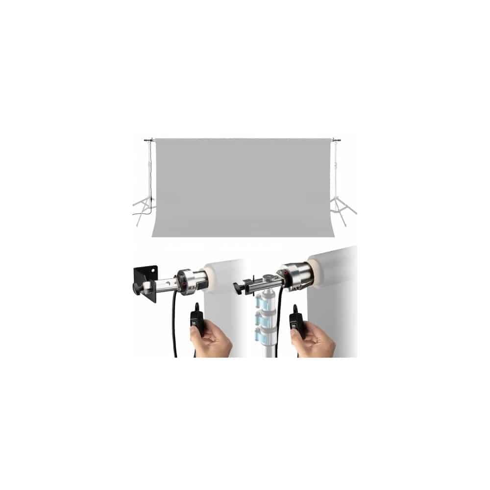 El sistema eléctrico BRESSER MR-300 para fondo de estudio ha sido desarrollado para optimizar el espacio disponible en el estudio de fotografía. El soporte de fondo de estudio es adecuado para 1 rollo de fondo y se suministra con un mando a distancia.