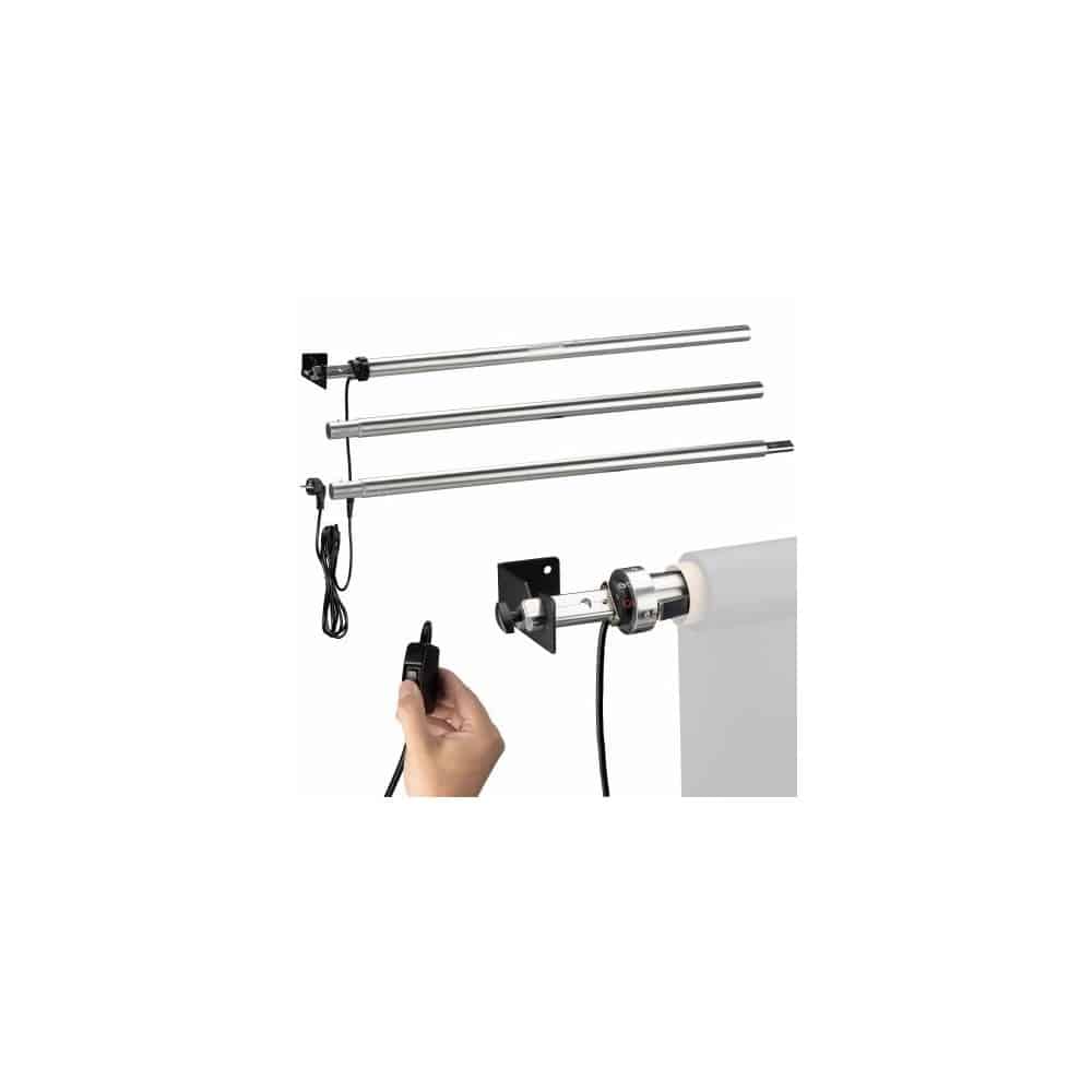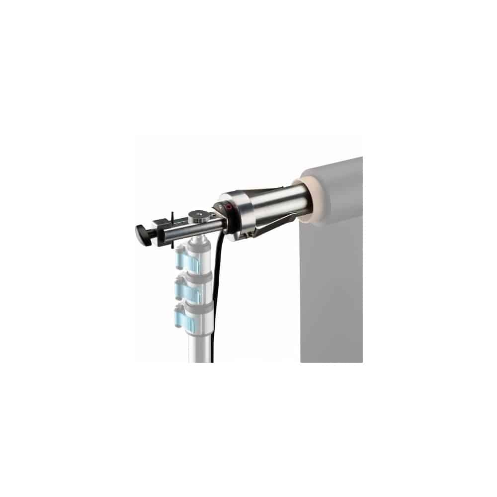 La barra transversal está equipada con un motor interno. Dos soportes móviles sujetan firmemente el rollo de fondo de estudio para que gire junto con la barra transversal, y además permiten el uso de rollos de fondo de distintas anchuras, hasta un máximo de 2,72 m. La anchura total del sistema de fondo de estudio es de 300 cm.