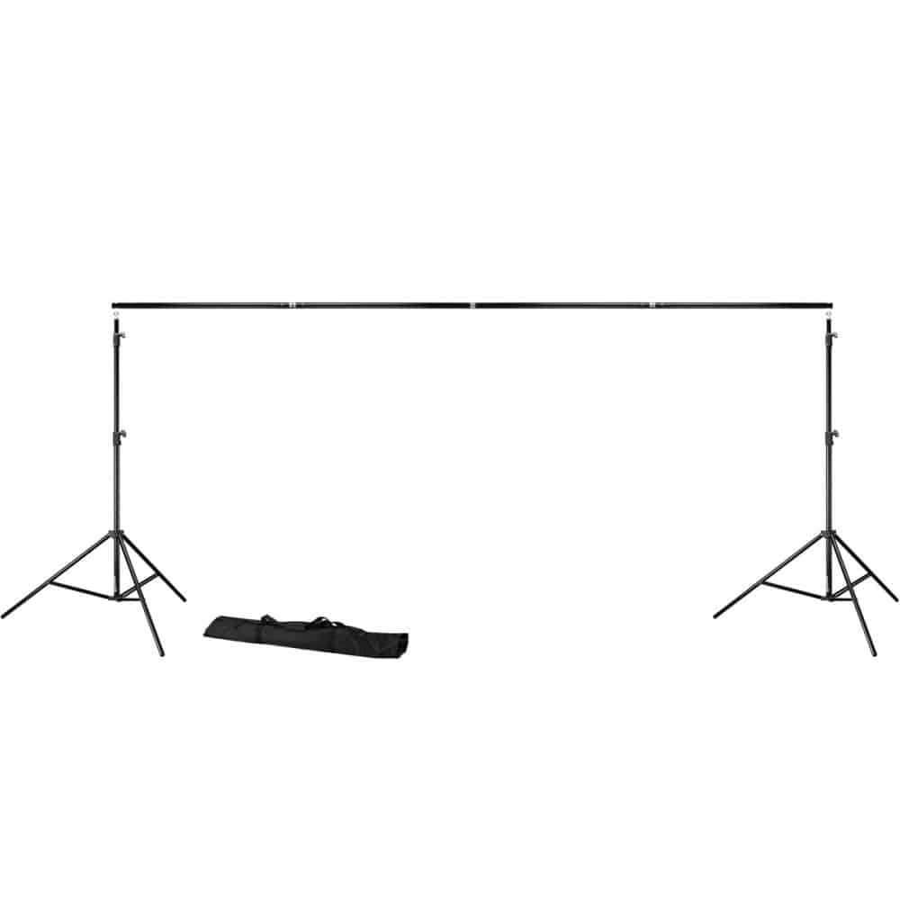 Formado por dos trípodes de aluminio resistentes y estables para lámparas que se pliegan de forma fácil y compacta. Sobre estos trípodes se coloca un travesaño que se puede ajustar a las medidas siguientes: 150 cm, 225 cm o hasta 300 cm. En este travesaño se puede colgar una tela, vinilo o un rollo de papel. En el trípode hay un sistema de suspensión neumática que amortigua las posibles vibraciones al bajarlo. El aluminio está recubierto con una capa pulverizada negra, con lo cual se reducen las reflexiones. El sistema de fondo de estudio es sencillo, muy funcional y de uso universal, ya que se suministra con una bolsa.