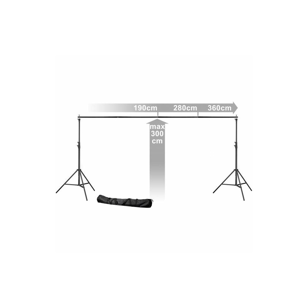 Los trípodes de las lámparas pueden ajustarse de forma variable hasta una altura de 300 cm y el travesaño de 4 partes puede ajustarse de forma flexible en la anchura de 180 cm/ 270 cm hasta 360 cm a la anchura de fondo. Con el diámetro constante de la barra transversal de 28 mm no hay puntos débiles y con el adaptador disponible opcionalmente BRESSER BR-D90 PRO-1 y la barra transversal también disponible opcionalmente BRESSER D-37 el sistema de fondo BRESSER BR-D37 Heavy Duty hace honor a su nombre y peude ser fácilmente ampliado a dos fondos utlizables.