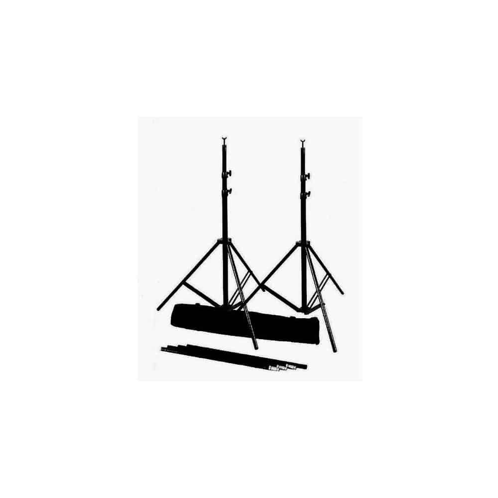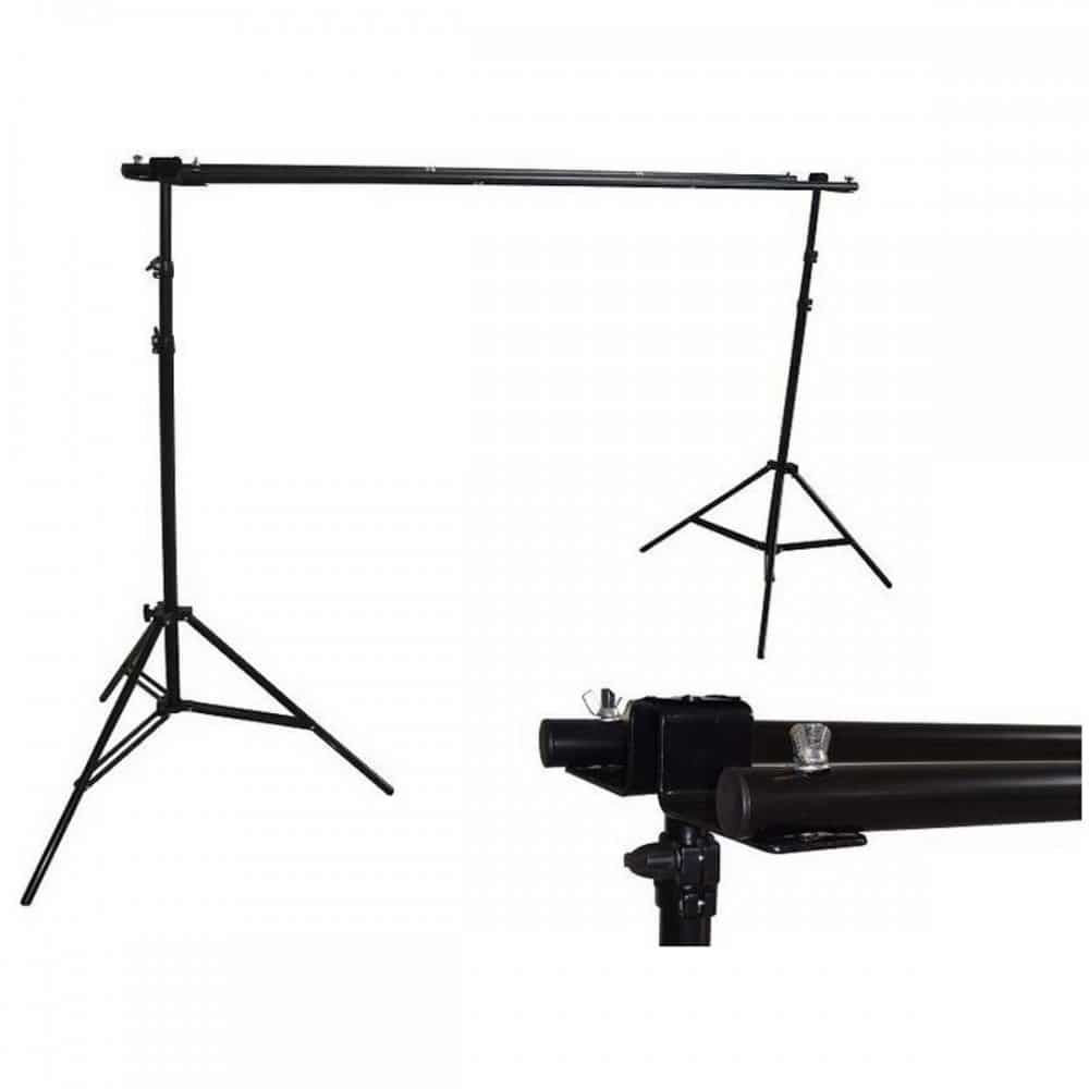 El sistema de fondo BRESSER D-56 para dos fondos consiste en dos trípodes de aluminio para lámparas con suspensión neumatica con altura de hasta 310 cm y dos robustos travesaños, que se pueden ensamblar a partir de 3 piezas con anchura de 300 cm.