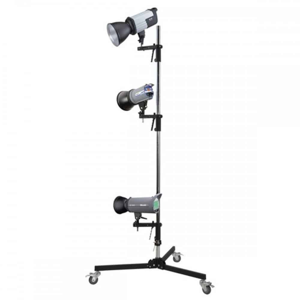 Se incluye 1 abrazadera de tubo con adaptador de espiga. Con las abrazaderas de tubo adicionales, disponibles opcionalmente, puede fijar varios flashes de estudio o accesorios al trípode. El trípode pesa 9,8 kg.