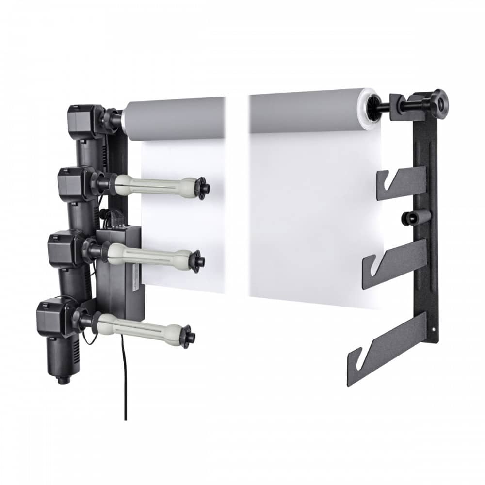 Un completo sistema de soportes eléctricos para colgar un máximo de 4 rollos de fondo de papel. Puedes enrollar o desenrollar los rollos con el mando a distancia incluido. Se pueden montar en la pared o en el techo, pero también sobre un trípode. Se puede utilizar con cualquier rollo de fondo ya que se ajustar el ancho.