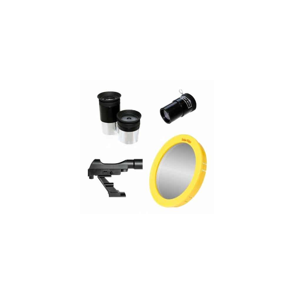 • Incluye: telescopio, montura ecuatorial, trípode, filtro solar, oculares y lente barlow, buscador LED, adaptador para smartphone