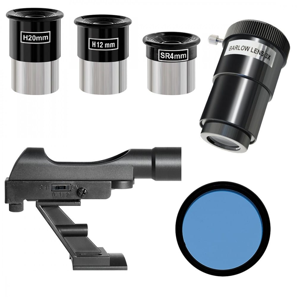 Volumen de suminsitro: tubo, montura, trípode de aluminio, 3 oculares, 3x lentes de Barlow, filtro lunar, buscador LEDr, mapa estelar