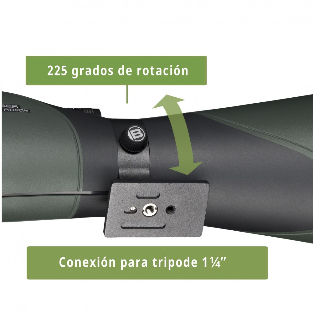 Los telescopios terrestres BRESSER Pirsch han sido diseñados sobre todo para observadores de la naturaleza y cazadores. Equipado con una óptica de 100 mm muy luminosa y con recubrimiento completo de varias capas, permiten mayores aumentos incluso al anochecer. Además, este telescopio terrestre está equipado con los revestimientos UR y corrector de fase de alta calidad para aumentar el brillo y el contraste de las imágenes. Junto con la carcasa estanca al agua y rellena de nitrógeno y el refuerzo exterior antirreflectante, con todas las condiciones meteorológicas los observadores de la naturaleza pueden, por ejemplo, determinar los tipos de pájaros, y los cazadores pueden aproximarse a las presas a gran distancia.