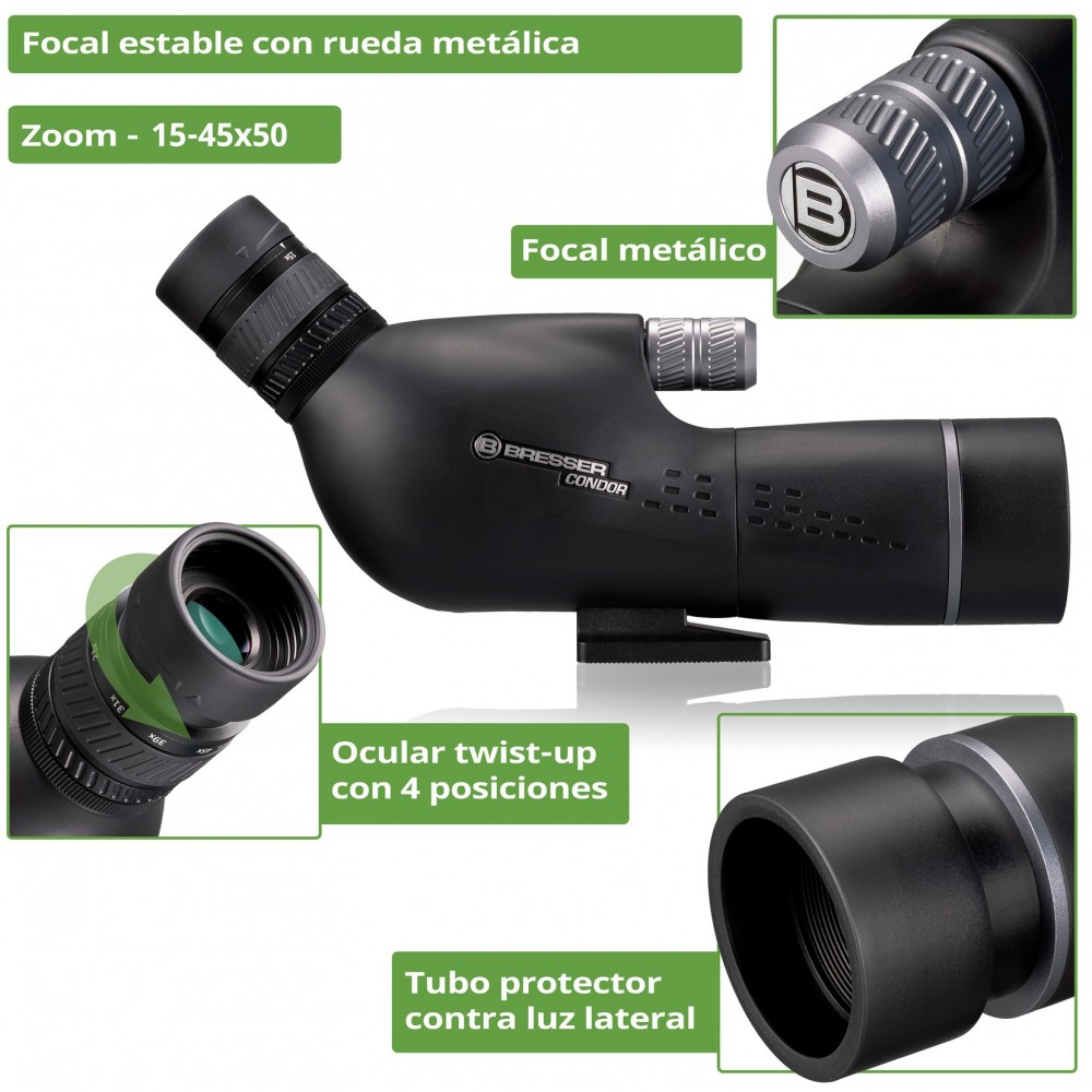 Todos los materiales del BRESSER Condor Gen. II, son de alta calidad. Esta serie cuenta con una rueda de enfoque metálica muy resistente que ajusta con precisión la nitidez.