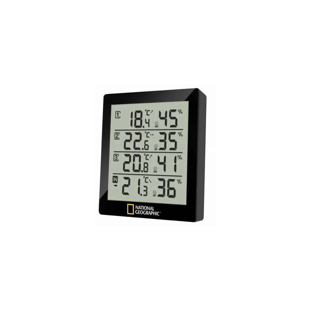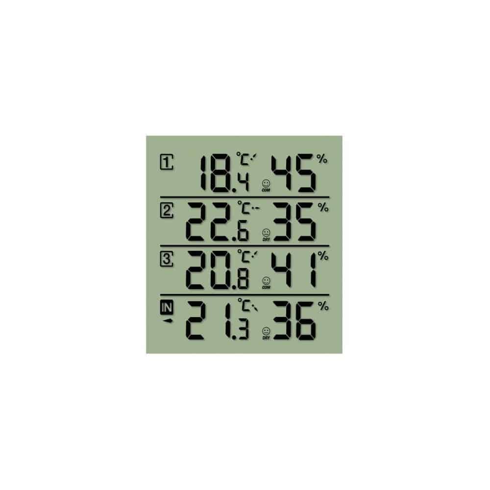 Con este termohigrómetro digital puede ver la temperatura y la humedad relativa, incluso para cuatro ubicaciones diferentes al mismo tiempo.