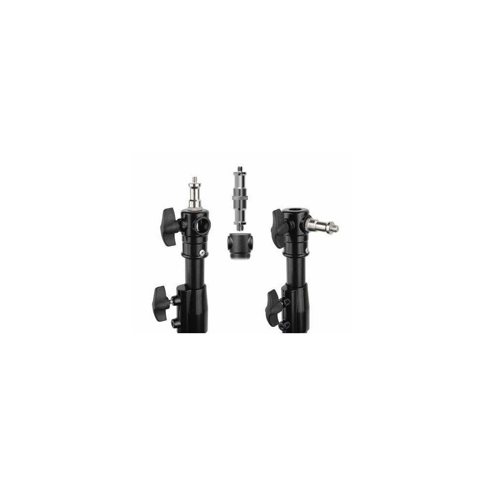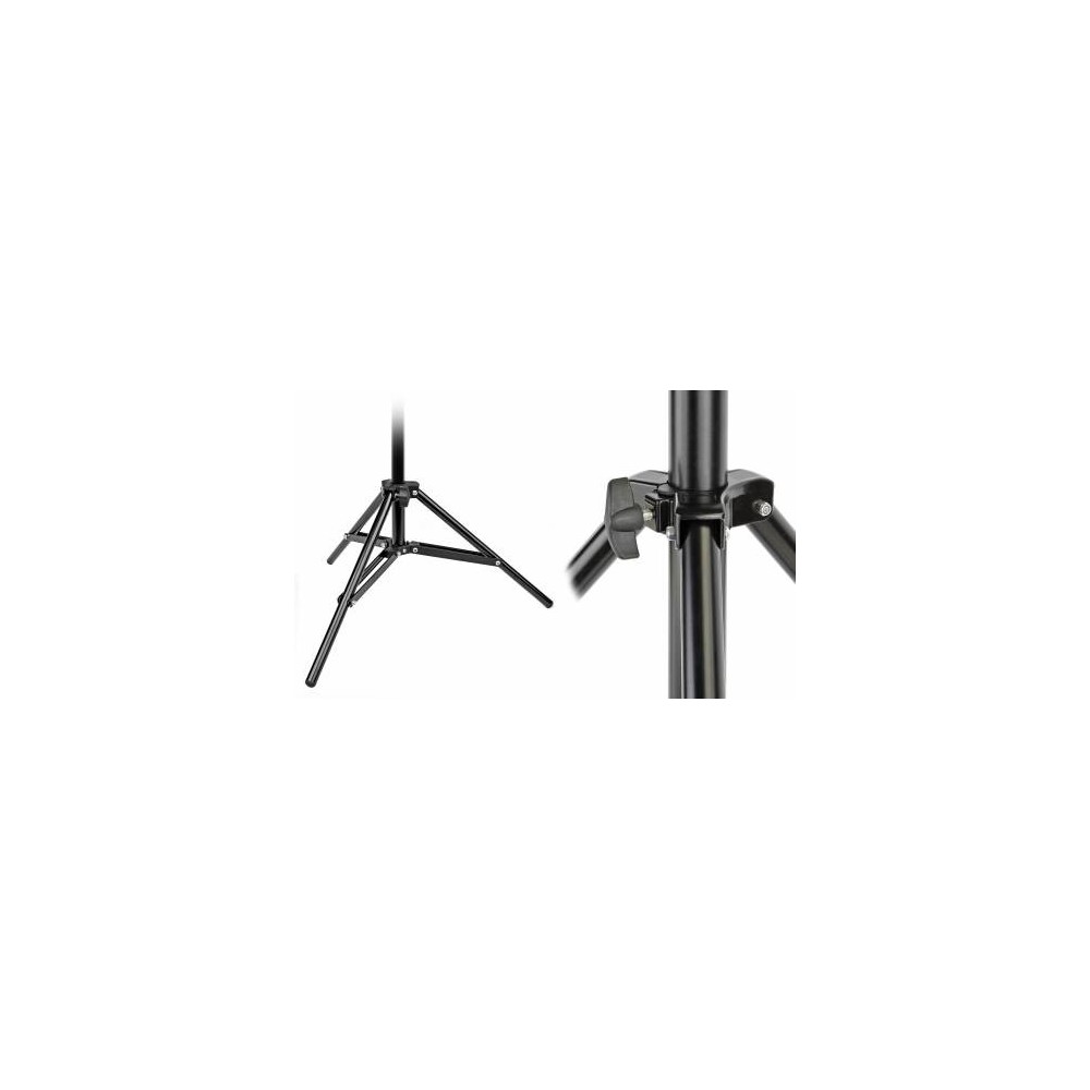 Soporte de luz de aluminio de 220 cm y equipado con un revestimiento de polvo negro para reducir la reflexión. El trípode es sólido y estable, se pliega fácilmente y de forma compacta. Está equipado con el sistema AirCushion de suspensión de aire que absorbe el impacto al bajar el flash o cualquier posible golpe.