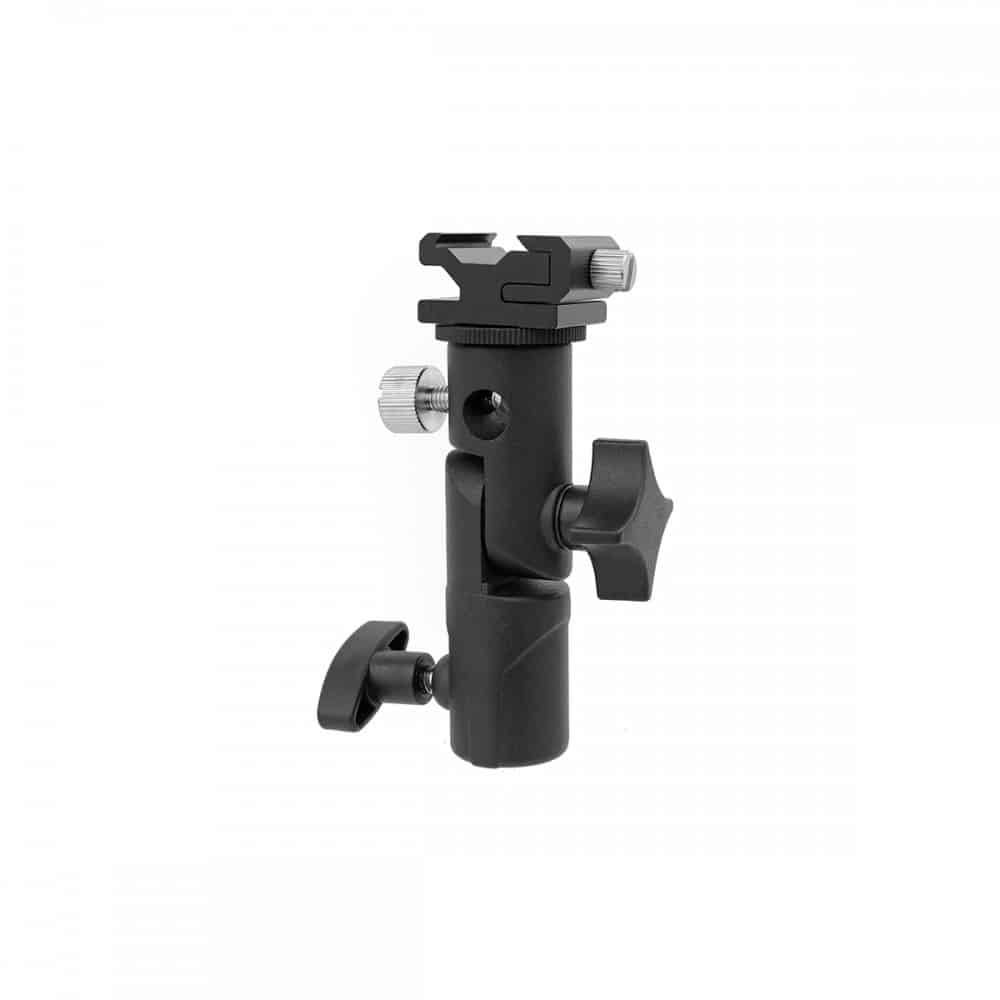 Un resistente soporte a trípode que permite colocar un flash de cámara a través de una zapata universal y además, permite conectar un paraguas de estudio. Se puede destornillar la zapata y en su lugar poner otros accesorios con una conexión de 1/4″.